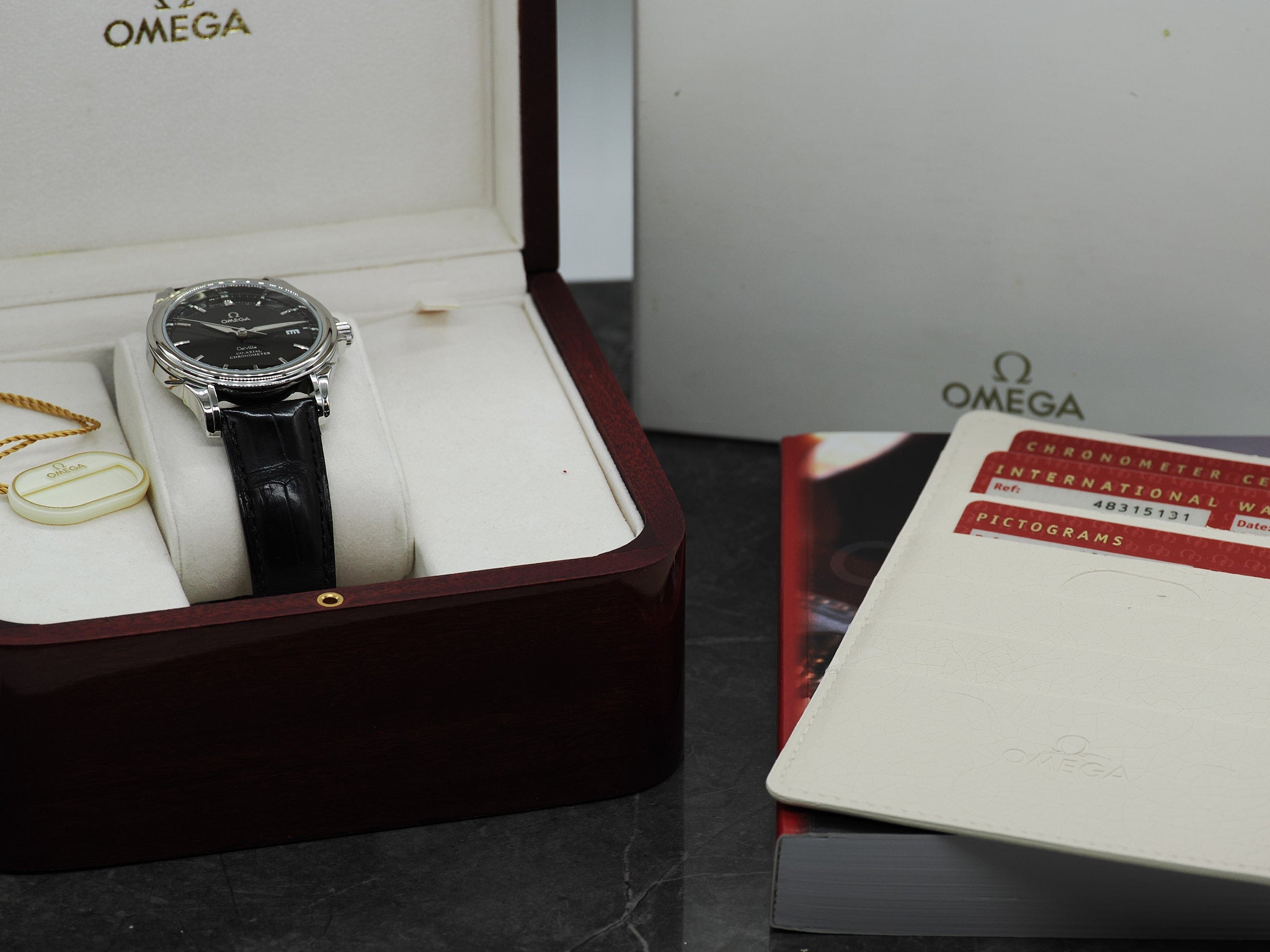 Das Fullset inkludiert: Die originale Omega De Ville, Garantiekarte (offenes Datum, Stempel), Pictogram-Karte, Chronometer Certifcate-Karte, Hangtag, Kartenhalter, Nachweis Wasserdichtigkeit (10 Bar) und Gangabweichung (4.8s/d), Bedienungsanleitung, Omega Box und Umkarton.