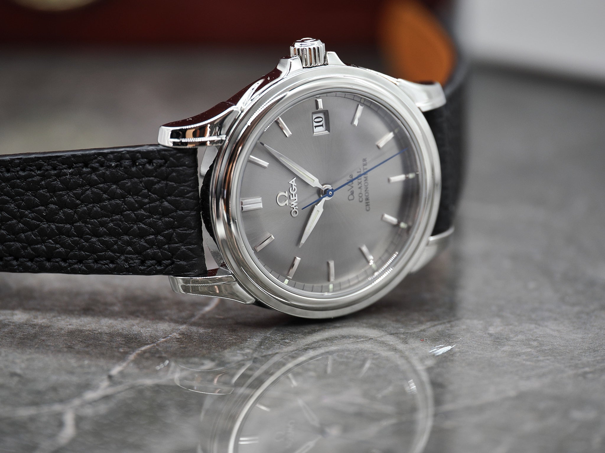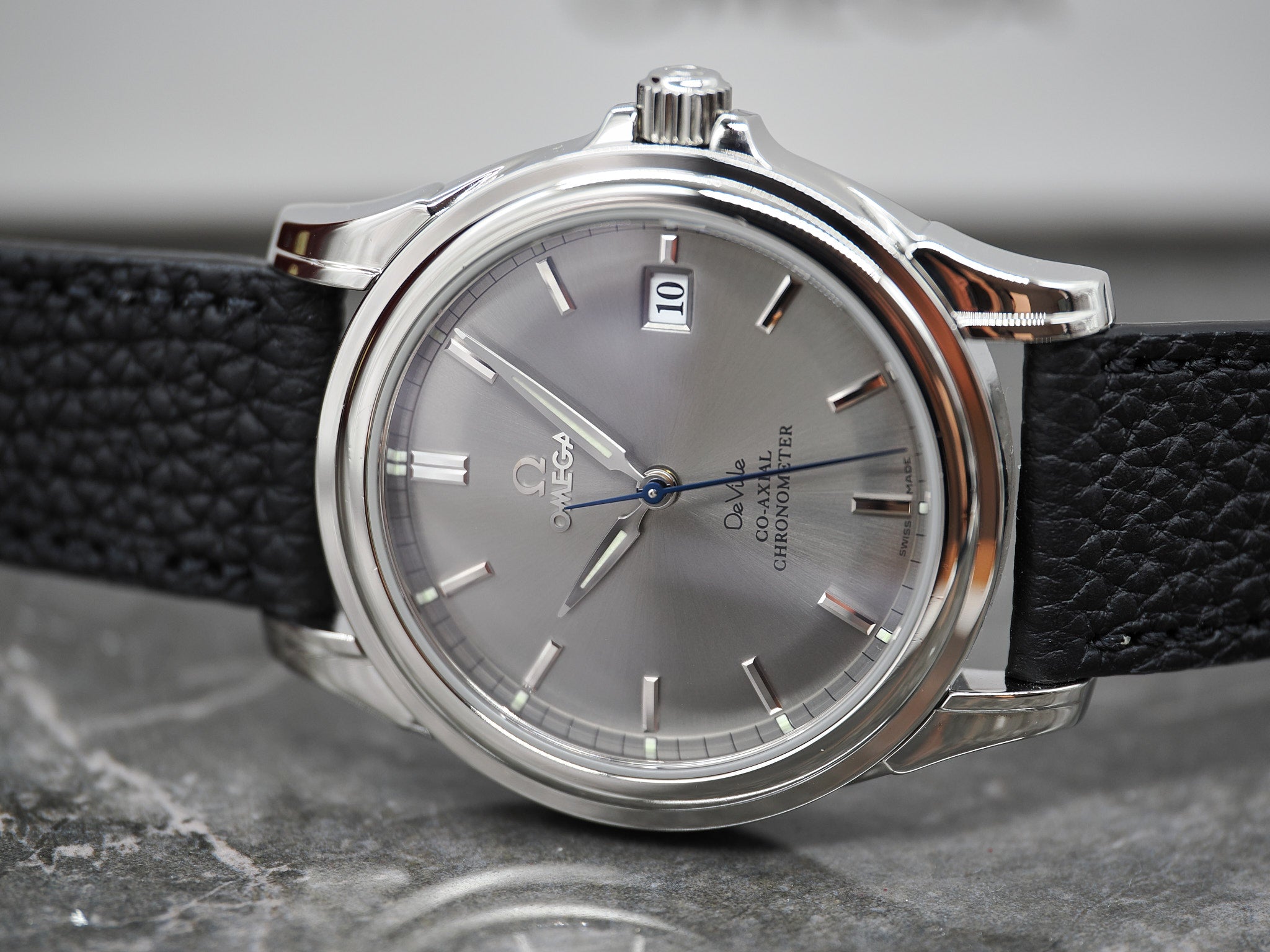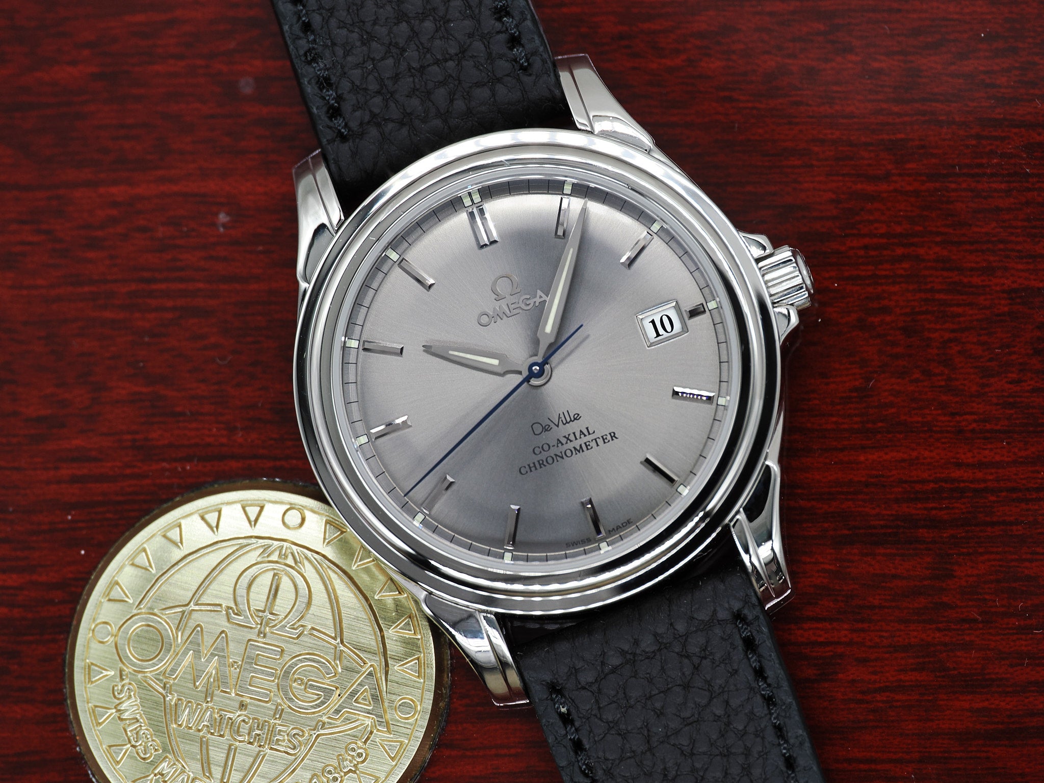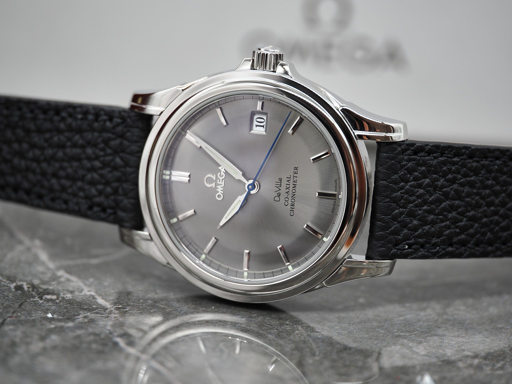 Der Durchmesser der Omega misst 37,5mm. An der Omega ist ein ungetragenes, handgemachtes Lederarmband mit Omega Dornschließe montiert.