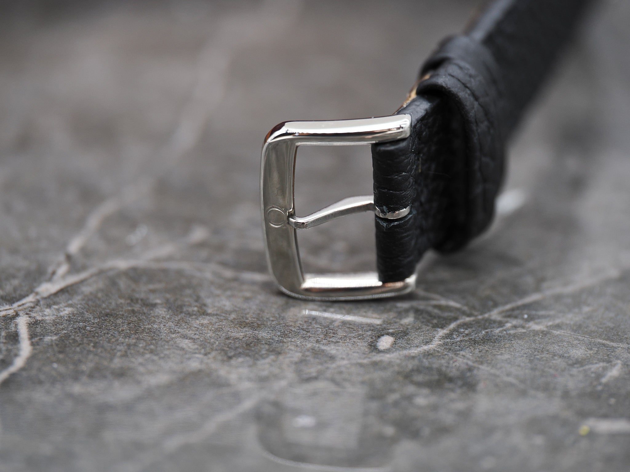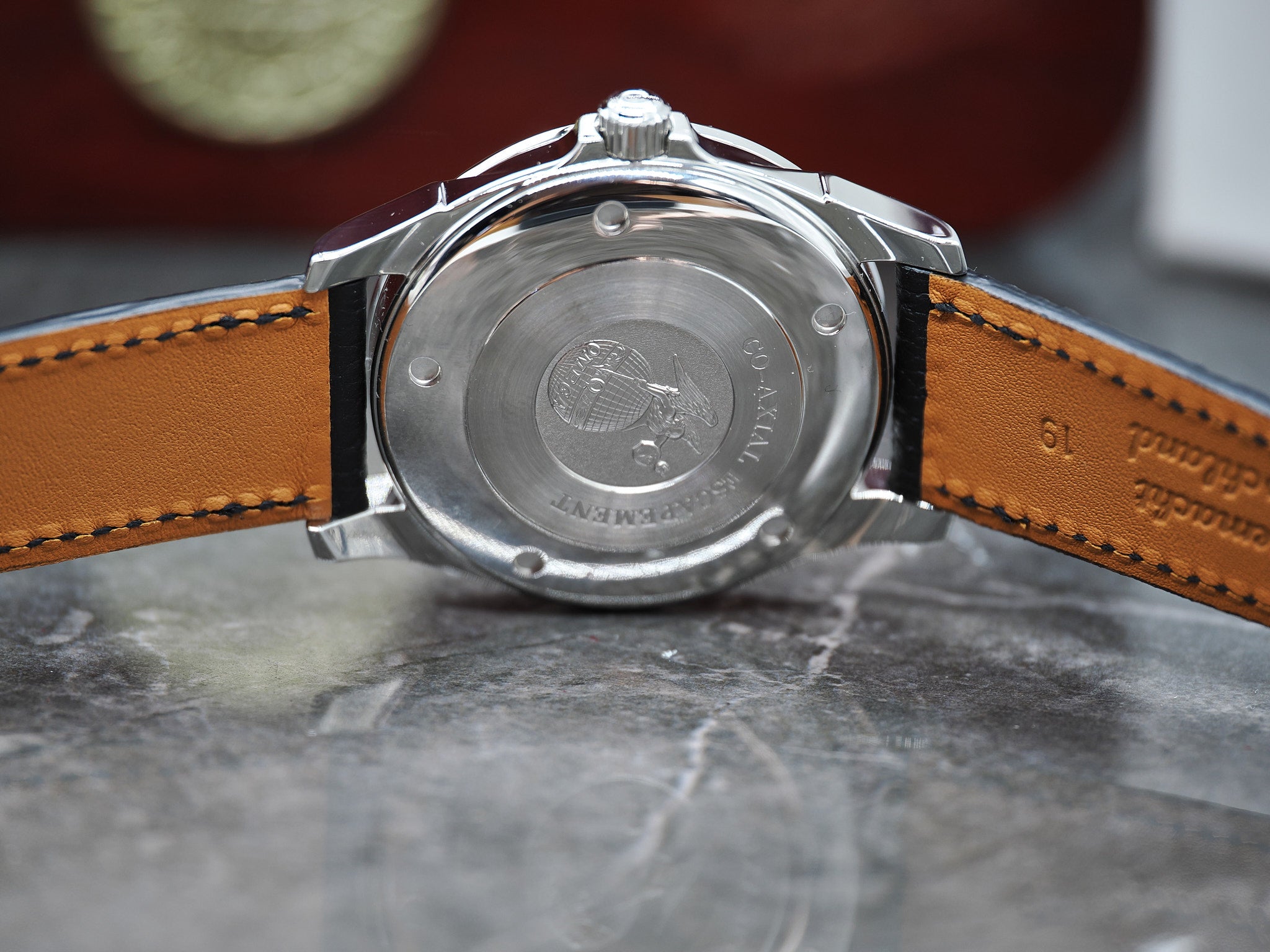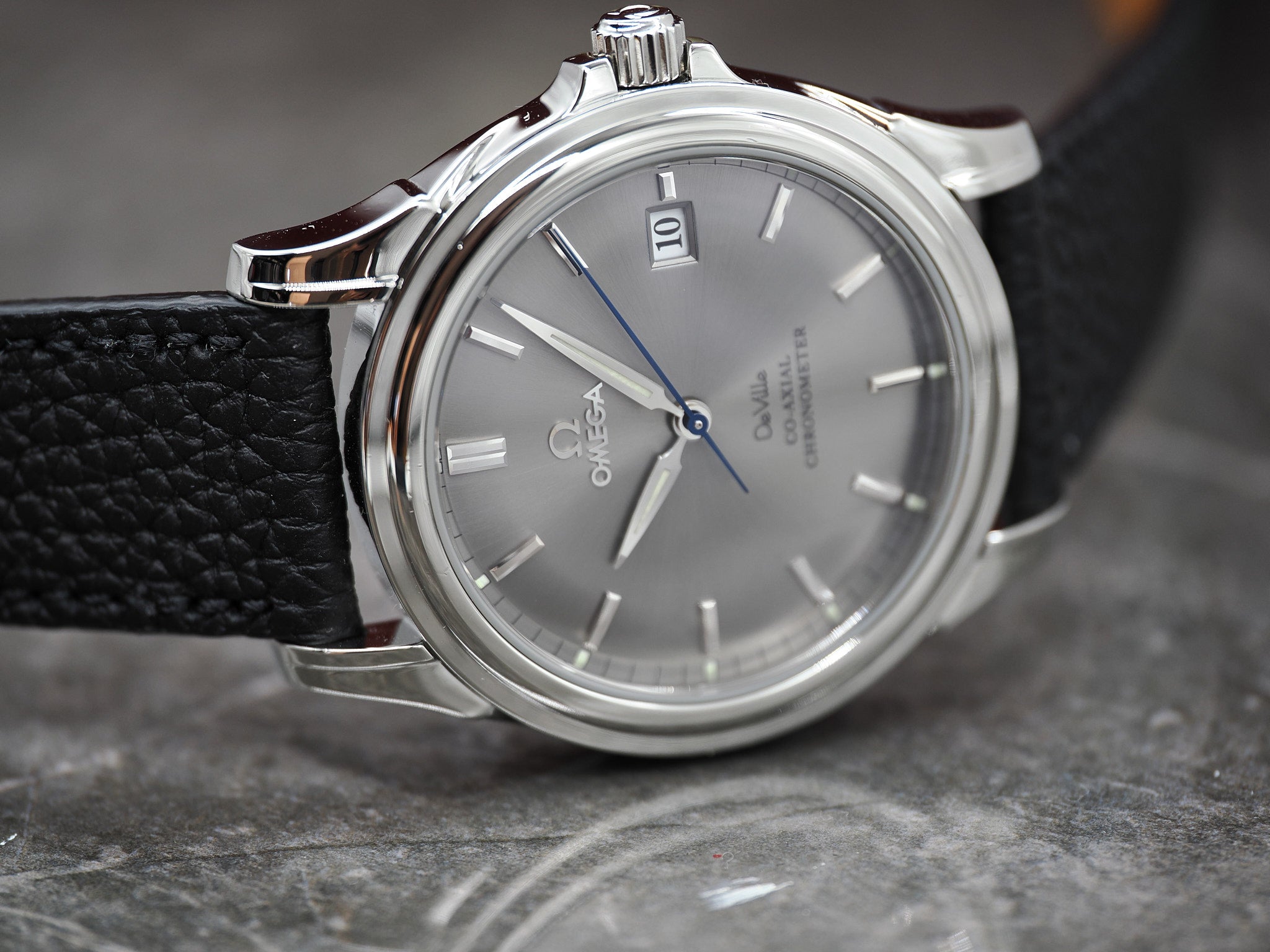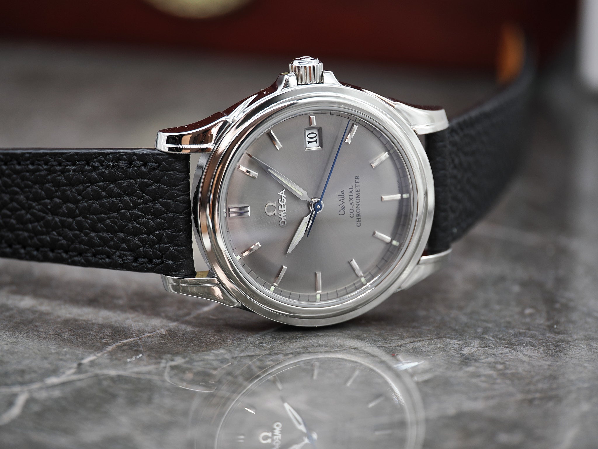 Der Durchmesser der Omega misst 37,5mm. An der Omega ist ein ungetragenes, handgemachtes Lederarmband mit Omega Dornschließe montiert.