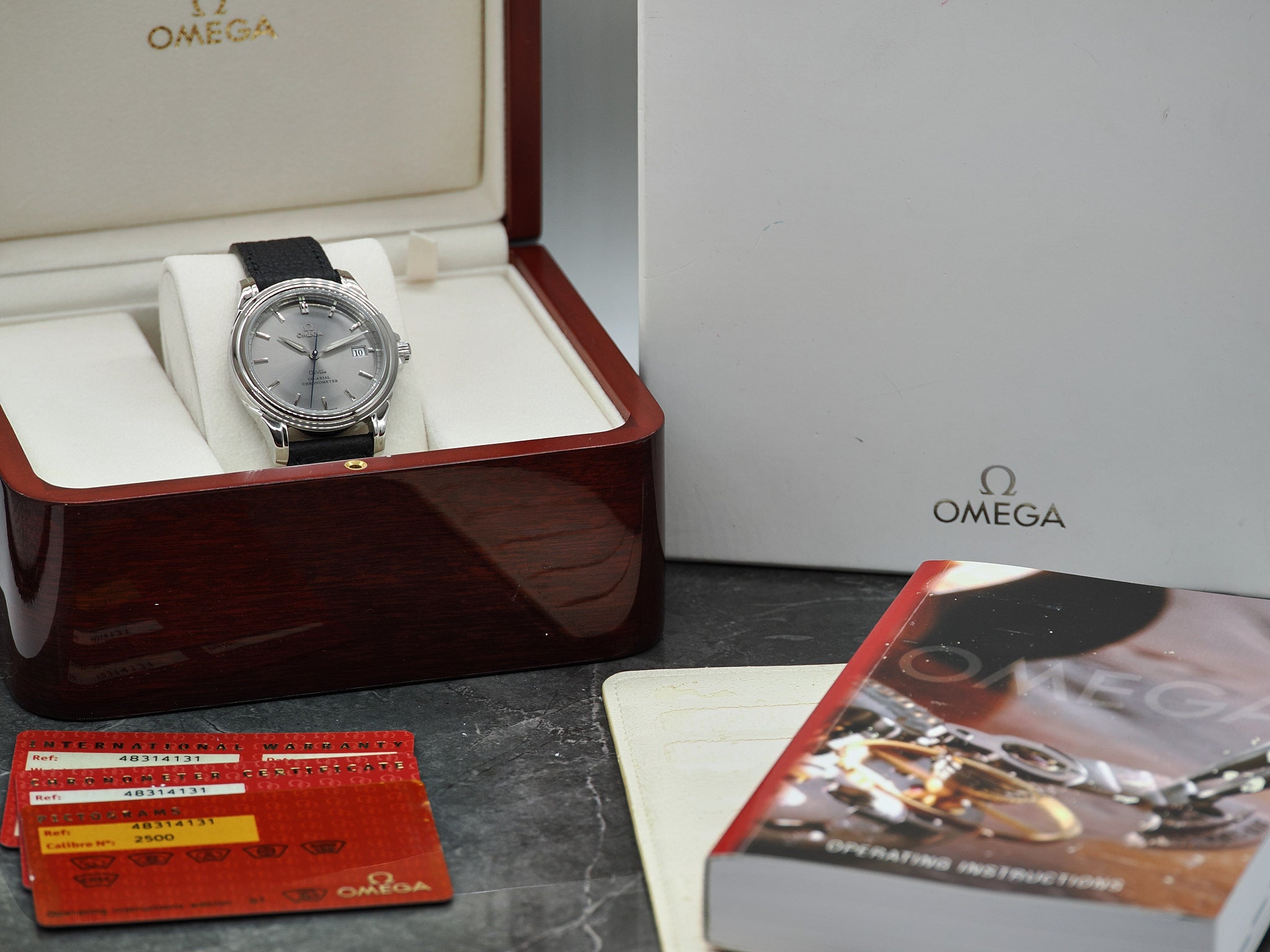 Das Fullset inkludiert: Die originale Omega De Ville, Garantiekarte (offenes Datum + Stempel), Pictogram-Karte, Chronometer Certifcate-Karte, Kartenhalter, Nachweis Wasserdichtigkeit (10 Bar) und Gangabweichung (3.3s/d), Bedienungsanleitung, Omega Box und Umkarton.