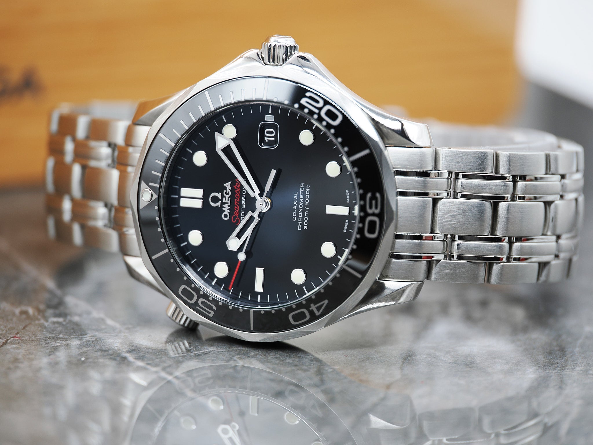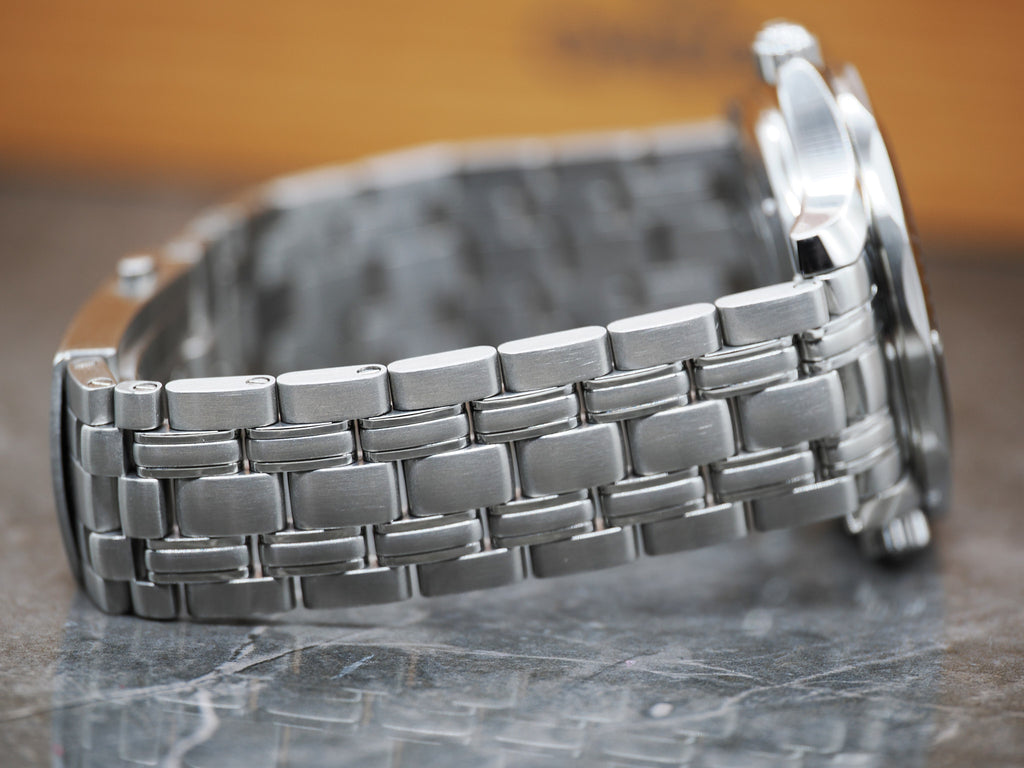 Der Durchmesser der Seamaster beträgt 41mm. Es sind alle Bandglieder vorhanden.