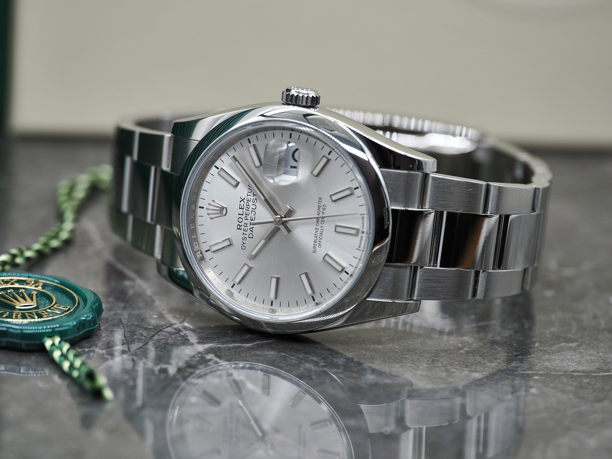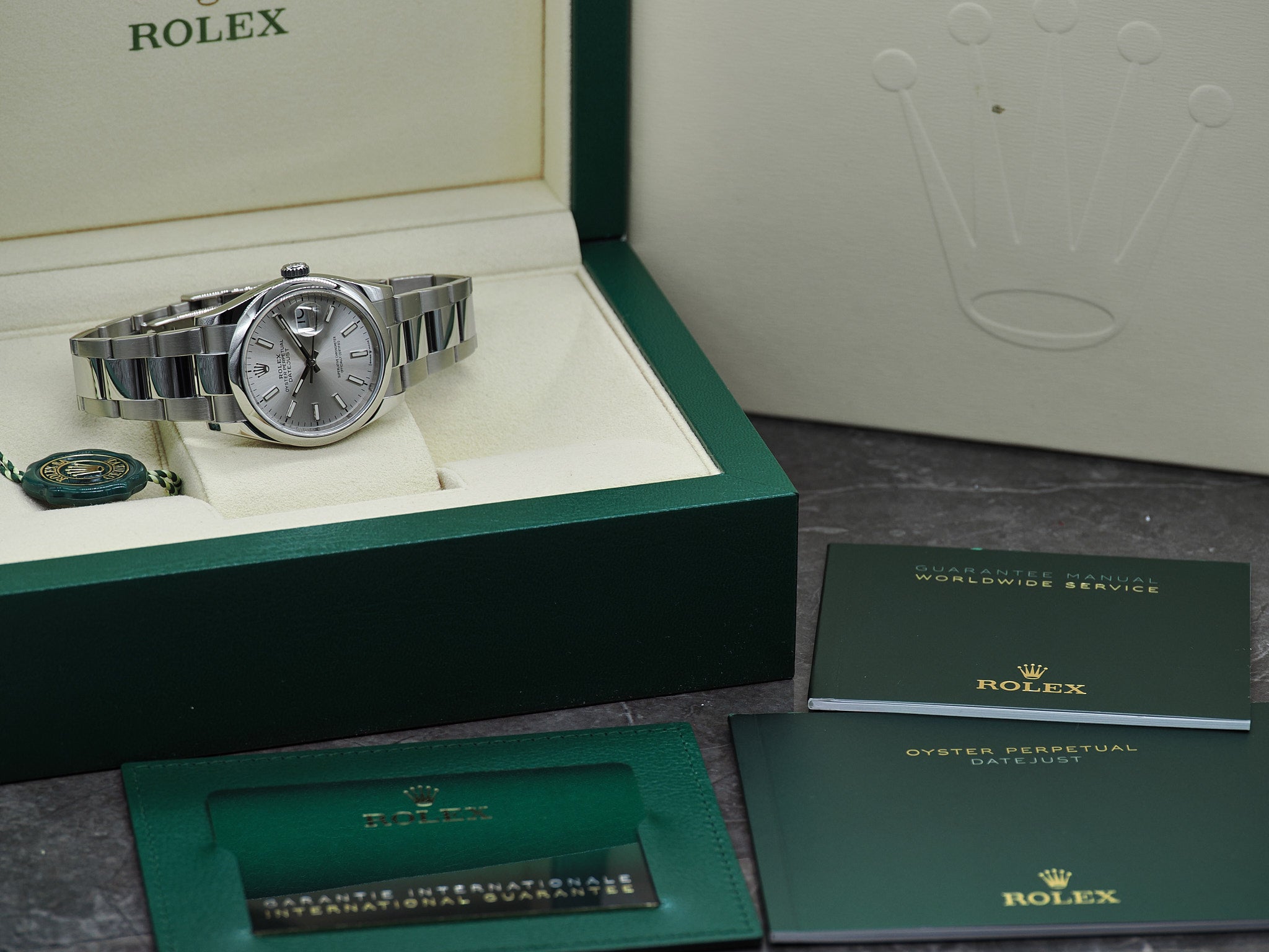 Das Fullset inkludiert die Rolex Datejust 126200, Kartenhalter, Garantiekarte (04/2021), Hangtag, Begleithefte, Nachweis Gangabweichung (2s/d) und Wasserdichtigkeit (10 Bar), Box und Umkarton.