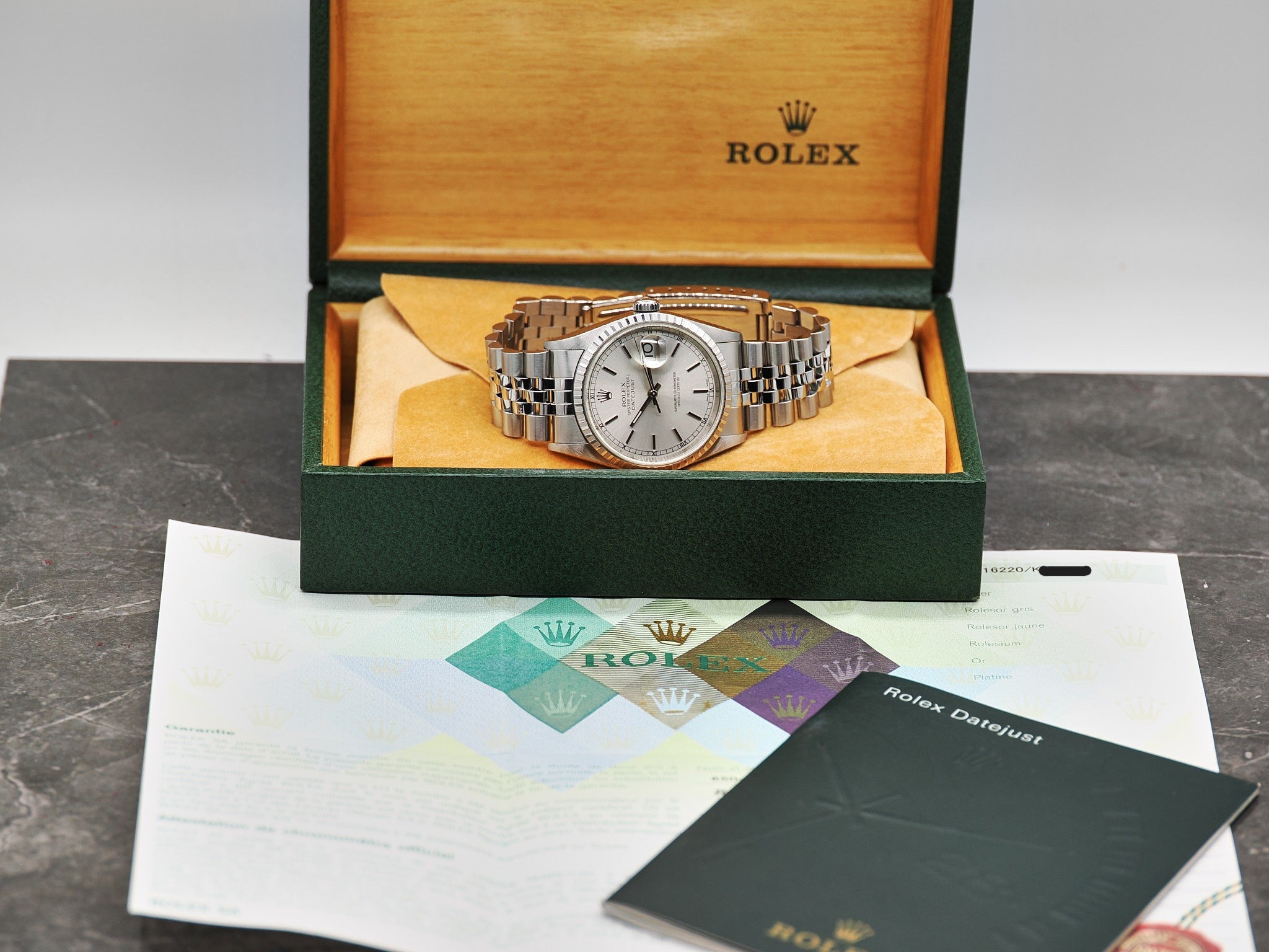 Das Paket inkludiert die Rolex Oyster Perpetual Datejust Ref. 16220, Garantiezertifikat (LC410 - 06.2005), Booklet, Nachweis Wasserdichtigkeit (5 Bar) und Gangabweichung (2.6s/d), sowie die Rolex Box.