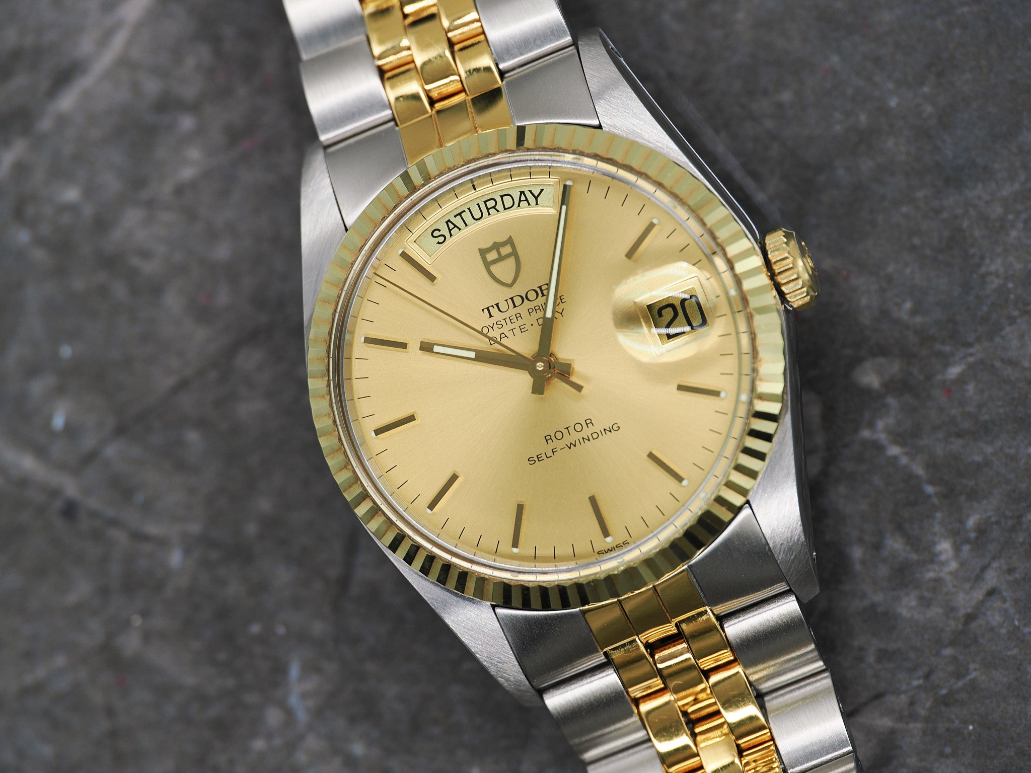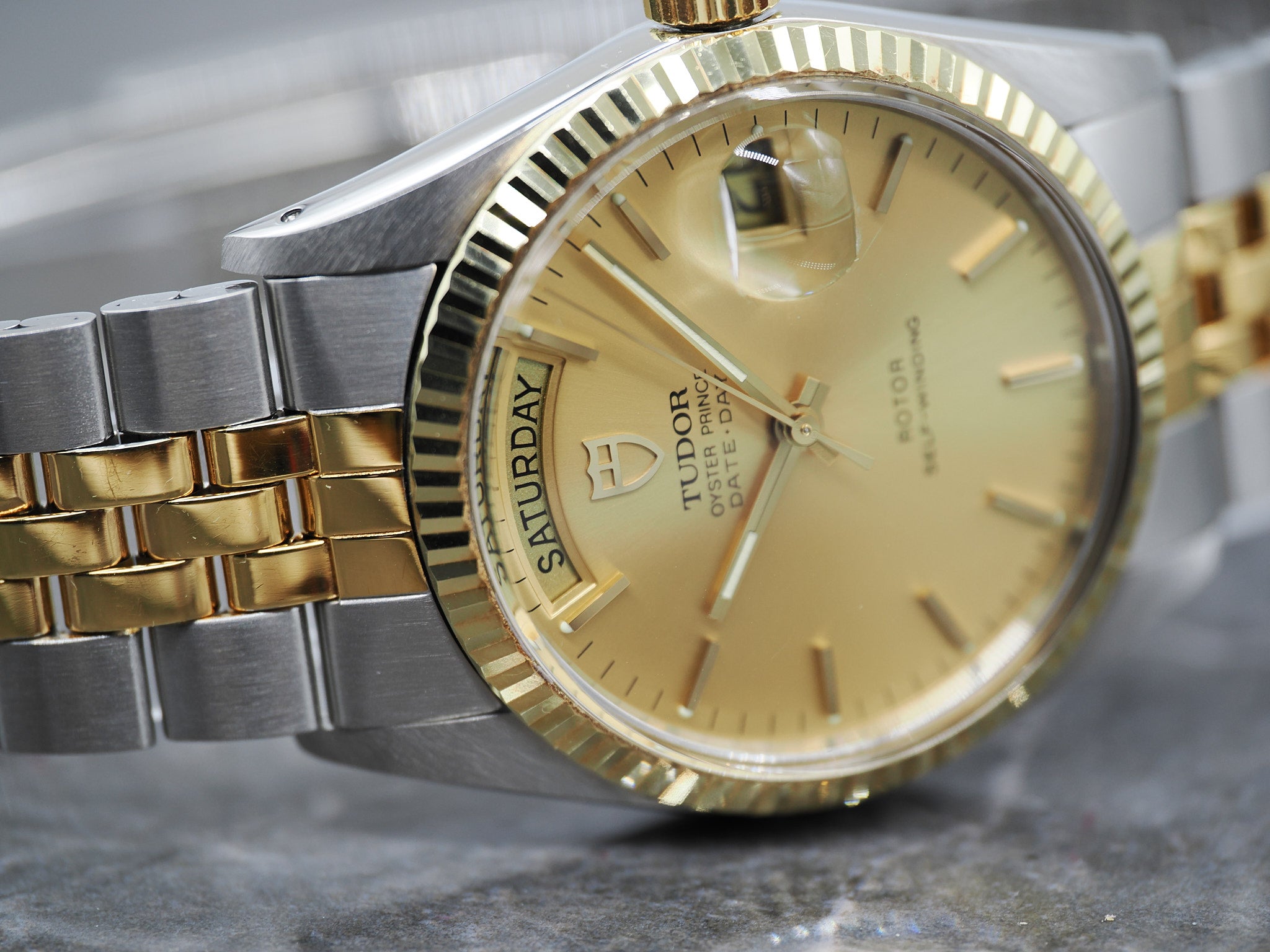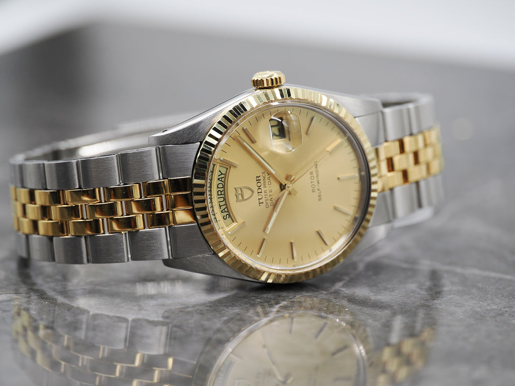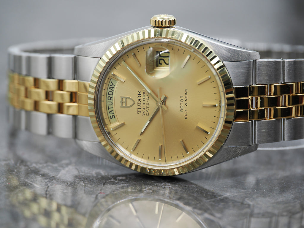 Tudor Oyster Prince Date Day - Referenz 94613 mit goldenen Zifferblatt und goldener Lünette.