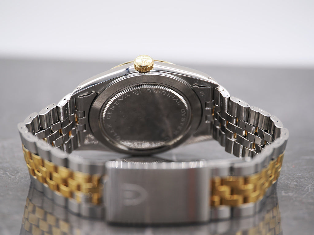 Klassische Linien, eine Day Date Komplikation und ein Emblem des Hauses Tudor: Die Tudor Prince Date Day - das Pendant zur Rolex Day Date. Die Produktion des hier inserierten Modells wurde bereits eingestellt und die Prince Date Day bleibt eines der beliebtesten Modelle aus dem Hause Tudor. Die Referenzen 94xxx sind deutlich seltener als die Referenzen 76xxx und verfügen über das begehrte Rolex Oyster Case und die Rolex Krone. Die Seriennummer lautet 274xxx und der Schließencode N3. Das Baujahr wird auf 1989 geschätzt. Der Durchmesser der Tudor beträgt ca. 36mm. Alle Bandglieder sind vorhanden und montiert. Zustand Die Tudor befindet sich optisch in einem sehr guten Zustand. Das Jubilee-Band weist keinen nennenswerten Stretch auf. Es gibt nur wenige altersbedingte Gebrauchsspuren. Bitte nutzen sie die hochauflösenden Bilder um sich einen Eindruck zu verschaffen, diese gelten als Zustandsbeschreibung. Das Werk der Tudor funktioniert einwandfrei. Es besteht langfristig kein Bedarf für einen Service. Sie erhalten 12 Monate Garantie auf das Uhrwerk. Die originale Box und Papiere sind nicht vorhanden. Das Set inkludiert: Die Tudor Oyster Prince Date Day, Nachweis Wassserdichtigkeit (5 Bar) und Gangabweichung (3.9s/d). Bei Fragen können Sie uns jederzeit kontaktieren. Händlerrechnung Zu diesem Artikel wird Ihnen selbstverständlich eine Händlerrechnung ausgestellt. Mehrwertsteuer Der Artikel wird nach § 25 A USTG (Differenzbesteuerung) besteuert |