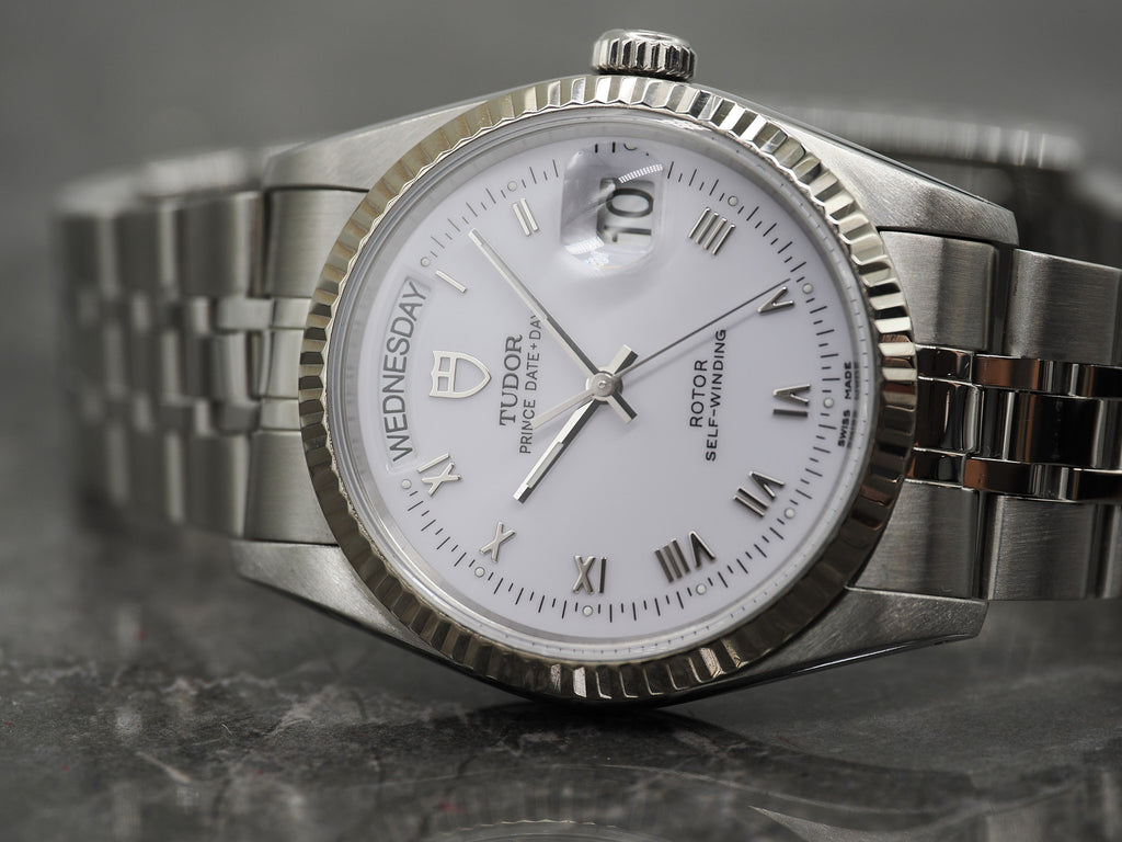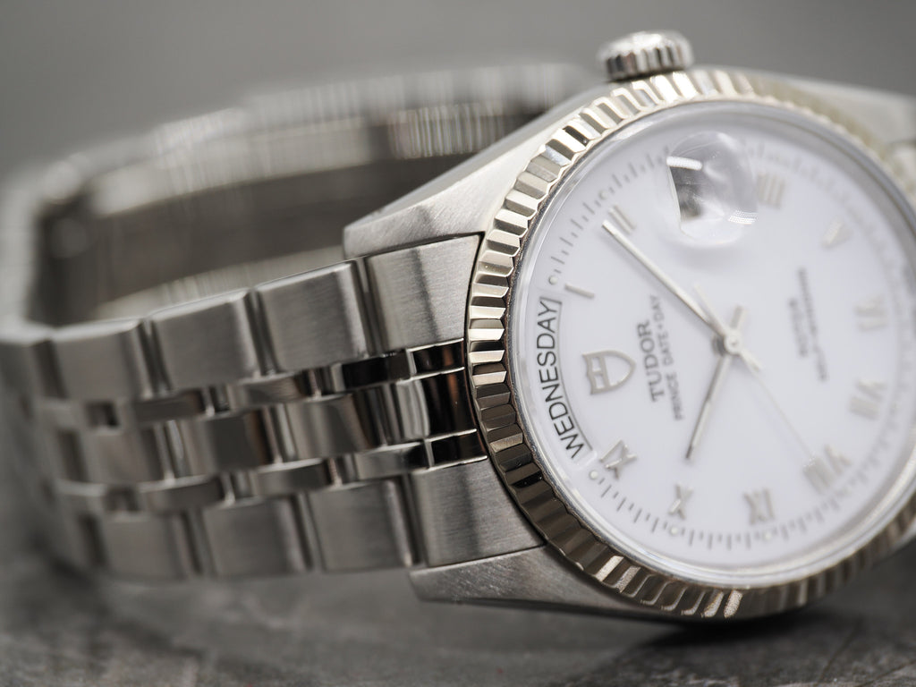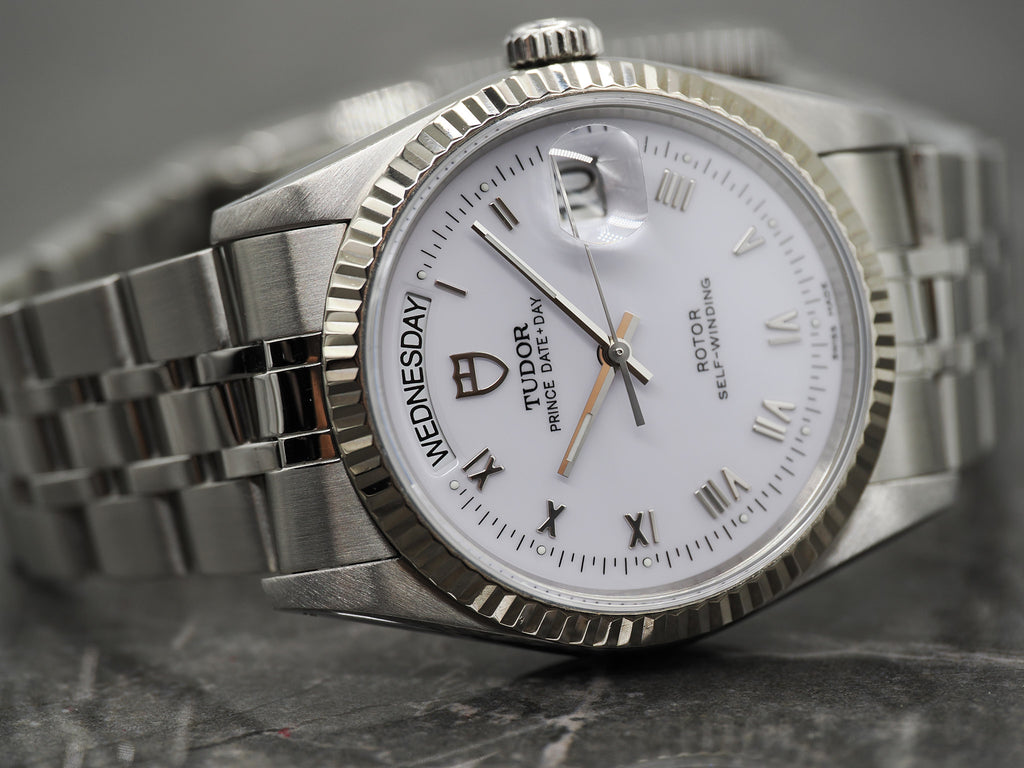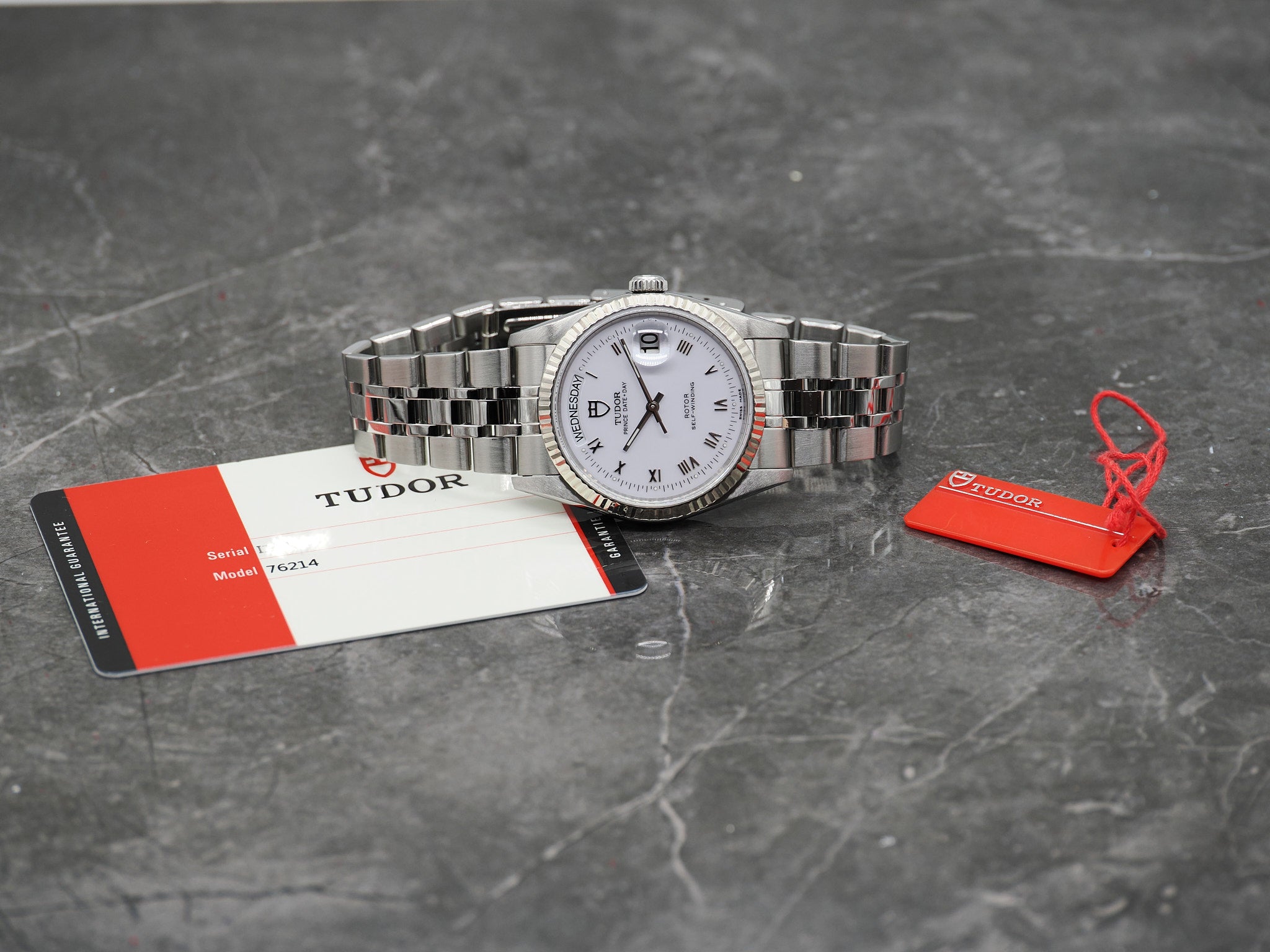 Tudor Prince Date Day Ref. 76214 mit Weißgoldlünette und weißem Zifferblatt mit Papieren aus 2016.