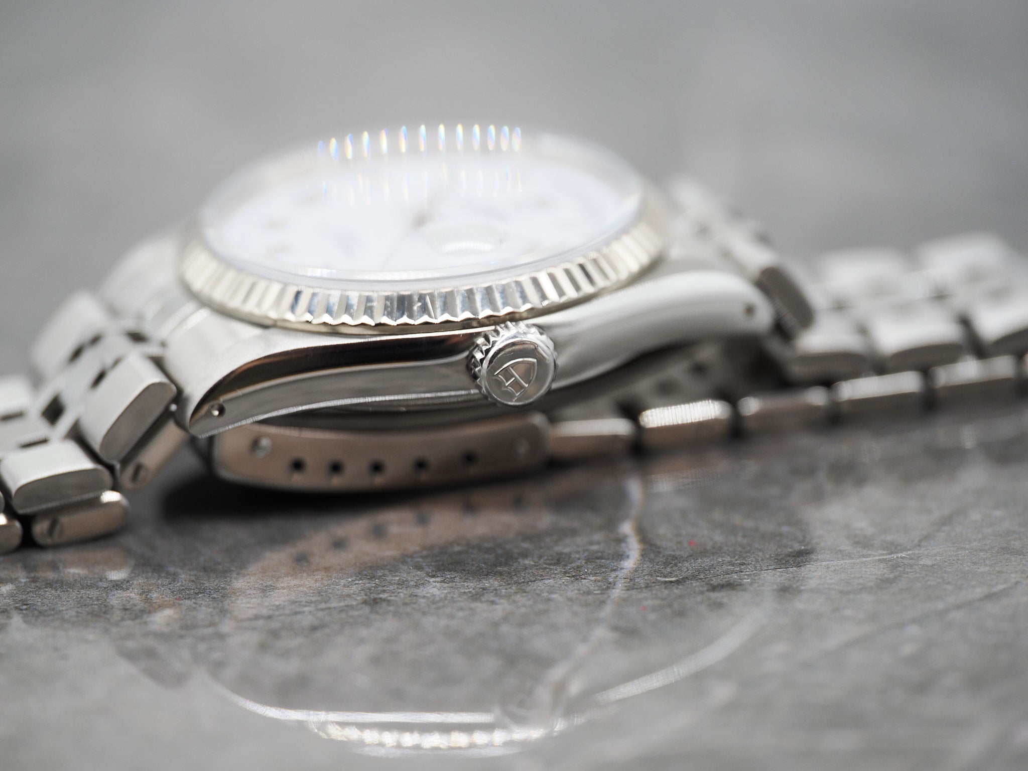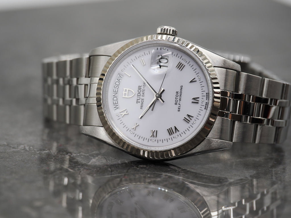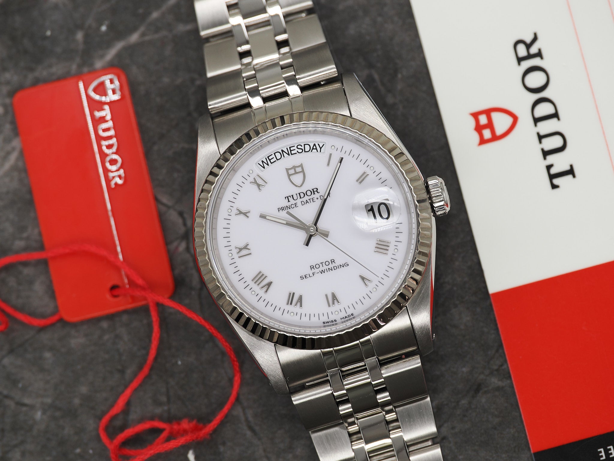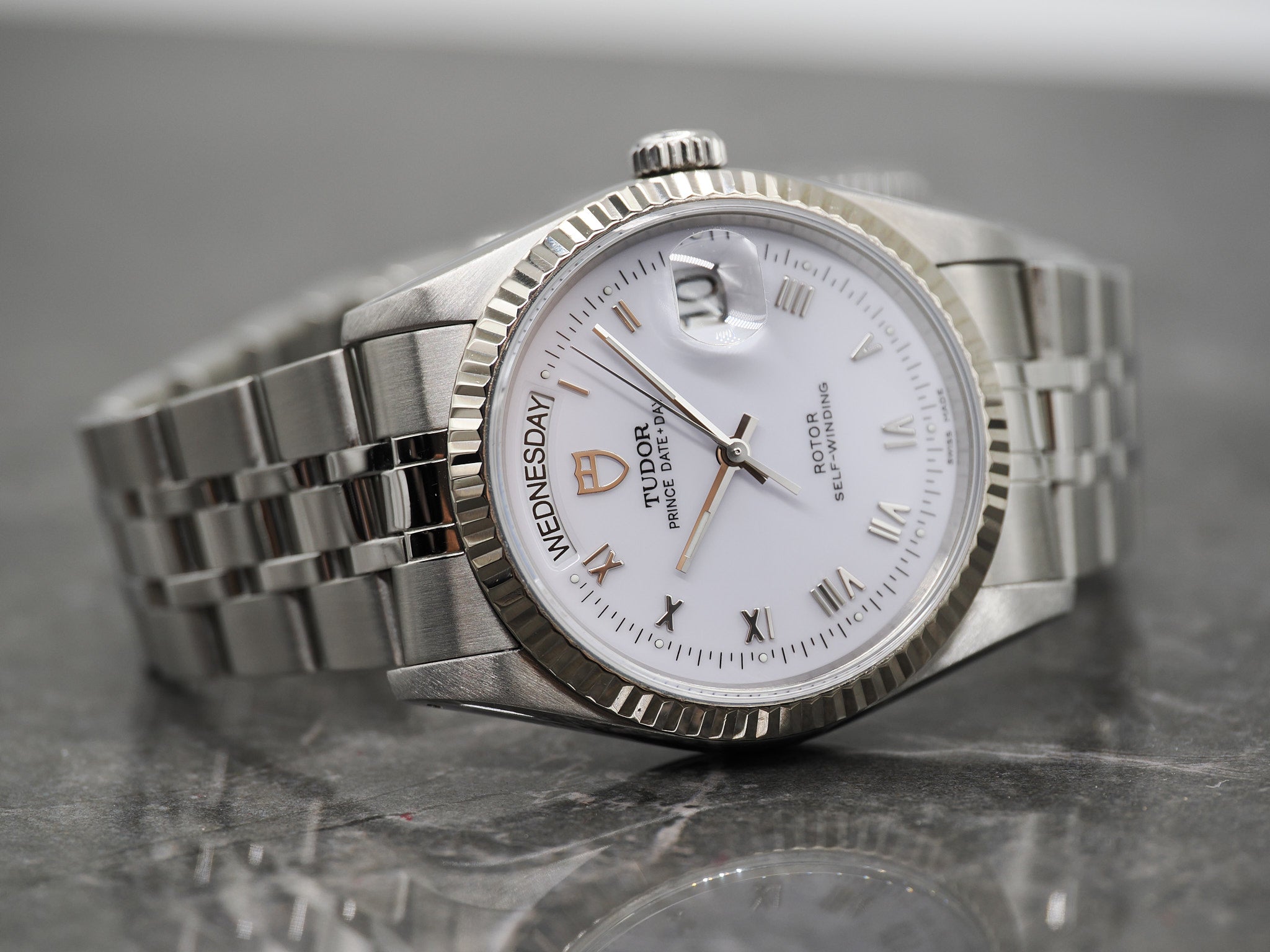 Tudor Prince Date Day Ref. 76214 mit Weißgoldlünette und weißem Zifferblatt mit Papieren aus 2016.