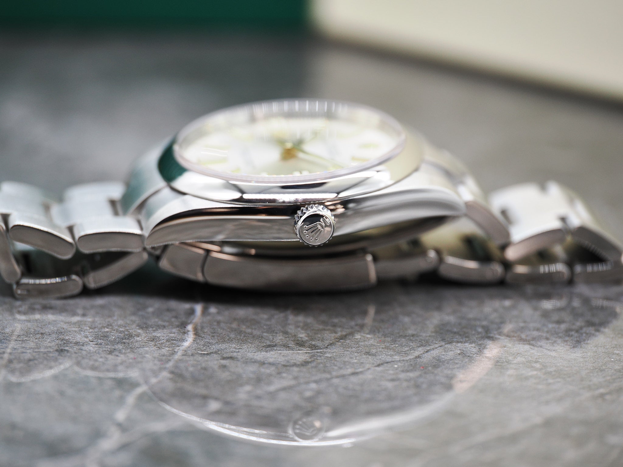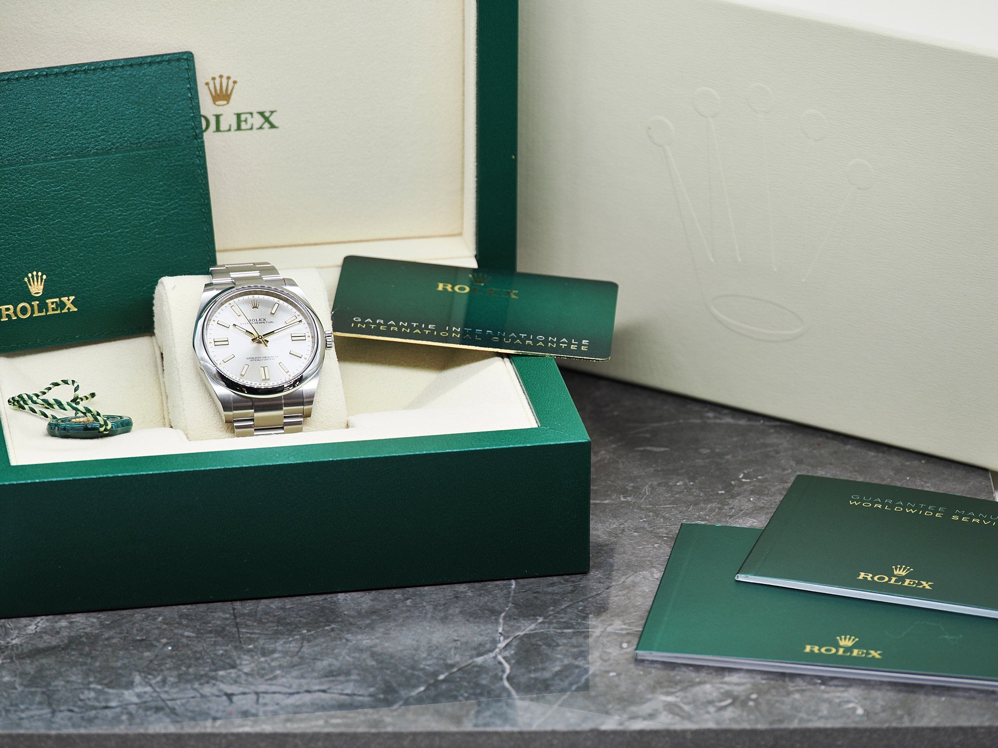 Die Oyster Perpetual ist ein Klassiker von Rolex. Sie wurde in den 50iger Jahren erstmalig vorgestellt. Die neuen Oyster Perpetual Zifferblätter wurden 2020 vorgestellt. Das Modell ist bereits eingestellt und wird nicht mehr produziert. Der Durchmesser der Rolex beläuft sich auf 41mm. Alle Bandglieder sind vorhanden. Die Oyster Perpetual befindet sich in einem sehr guten Zustand. Das Saphirglas ist kratzerfrei. Bitte nutzen Sie die hochauflösenden Bilder als Referenz der Zustandsbeschreibung. Die Rolex verfügt noch über die originale Herstellergarantie bis zum März 2026. Das Fullset inkludiert die Rolex Oyster Perpetual 124300, Rolex Garantiekarte 03.2021, Hangtag, Rolexmäppchen, Begleithefte, Nachweis Gangabweichung (0.5s/d) und Wasserdichtigkeit (10 Bar), Rolex Box und Umkarton. Händlerrechnung Zu diesem Artikel wird Ihnen selbstverständlich eine Händlerrechnung ausgestellt. Mehrwertsteuer Der Artikel wird nach § 25 A USTG (Differenzbesteuerung) besteuert. |