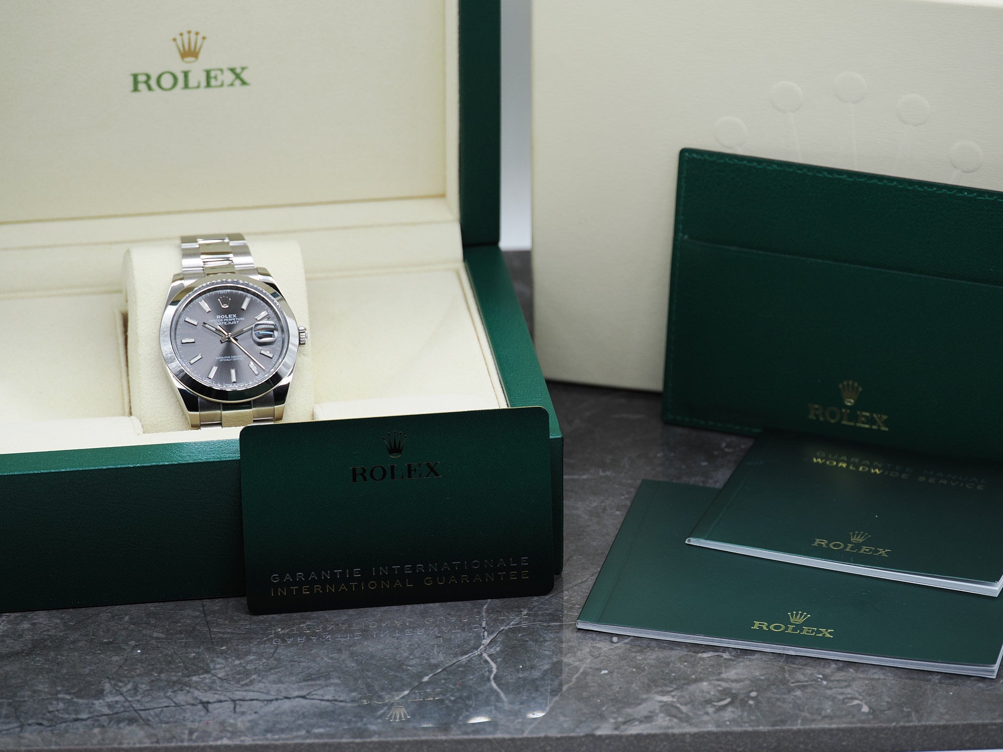 Das Fullset inkludiert die Rolex Datejust 126300, Kartenhalter, Garantiekarte (08/2021), Begleithefte, Nachweis Wasserdichtigkeit (10 Bar) und Gangabweichung (1.3s/d), Box und Umkarton.