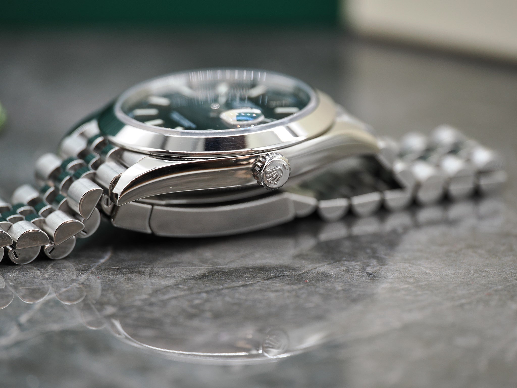 Eine Uhr die seinesgleichen sucht: Die Rolex Datejust. Die Geschichte der Rolex Datejust geht bis in das Jahr 1945 zurück und ist ein großer Bestandteil der Erfolgsgeschichte der sehr gefragten Marke Rolex. Die Datejust wurde damals als Uhr zur Feier des 40 jähriges Unternehmensjubiläum eingeführt und ist bis zum heutigen Tag Bestandteil der Rolex Kollektion. Bei Betrachtung der Bilder wird ersichtlich weshalb: Klare Strukturen, perfekte Qualität und eine Reputation in der Uhrenwelt, die kaum vergleichbar ist. Der Durchmesser der Rolex beläuft sich auf 41mm. Alle Bandglieder sind vorhanden. Optisch befindet sich die Datejust in einem sehr guten Zustand. Das Saphirglas ist kratzerfrei. Bitte nutzen Sie die hochauflösenden Bilder als Referenz der Zustandsbeschreibung. Technisch funktioniert die Rolex einwandfrei. Es besteht noch die originale Rolex Garantie bis 04.2028 (siehe Rolex 5 Jahre Garantie). Das Fullset inkludiert die Rolex Datejust 126300, Kartenhalter, Garantiekarte (04/2023), Hangtag, Begleithefte, beiliegendes Bandglied, Nachweis Wasserdichtigkeit (10 Bar) und Gangabweichung (1.4s/d), Box und Umkarton. Händlerrechnung Zu diesem Artikel wird Ihnen selbstverständlich eine Händlerrechnung ausgestellt. Mehrwertsteuer Der Artikel wird nach § 25 A USTG (Differenzbesteuerung) besteuert. |