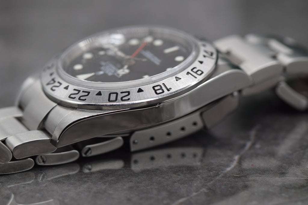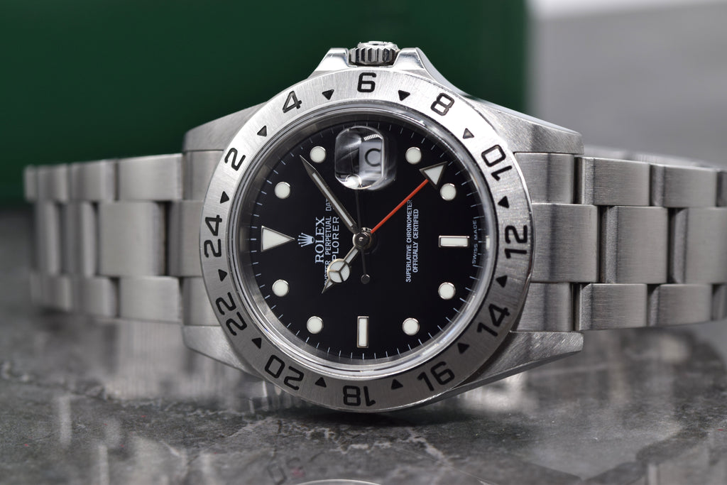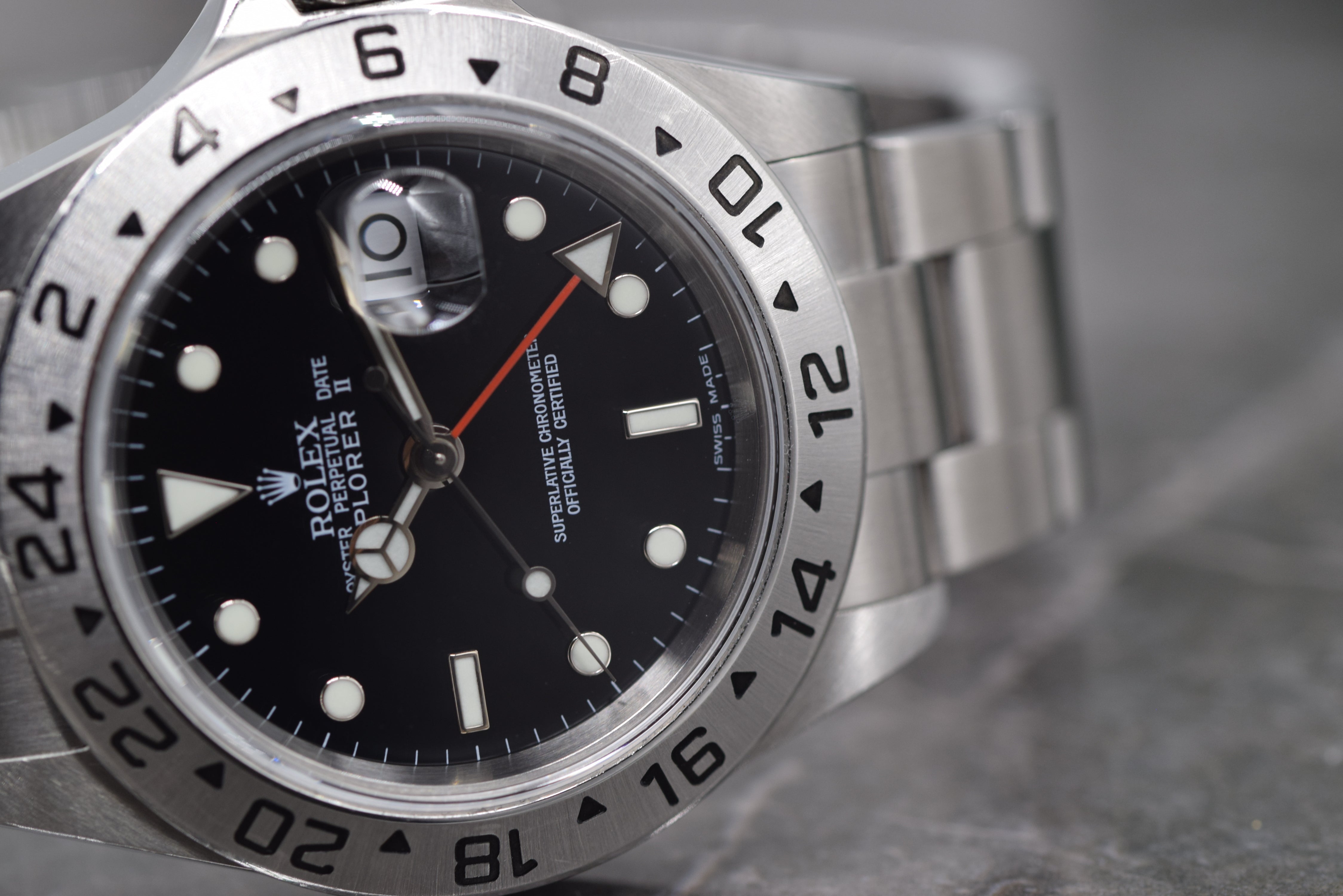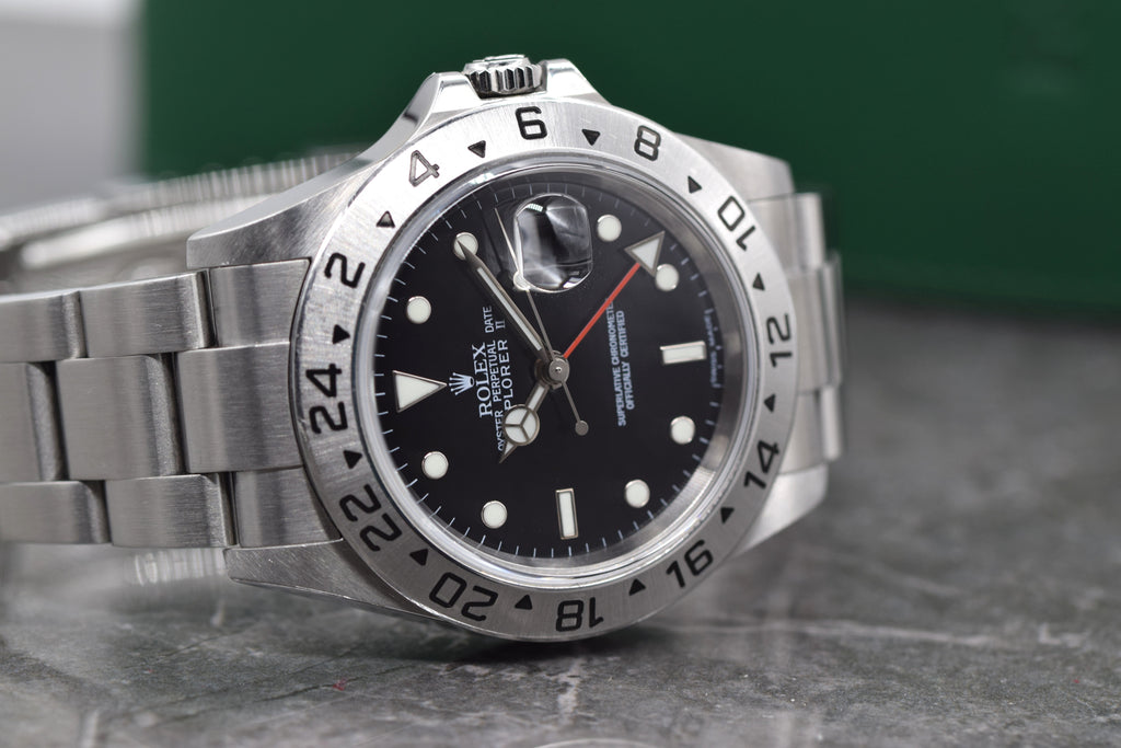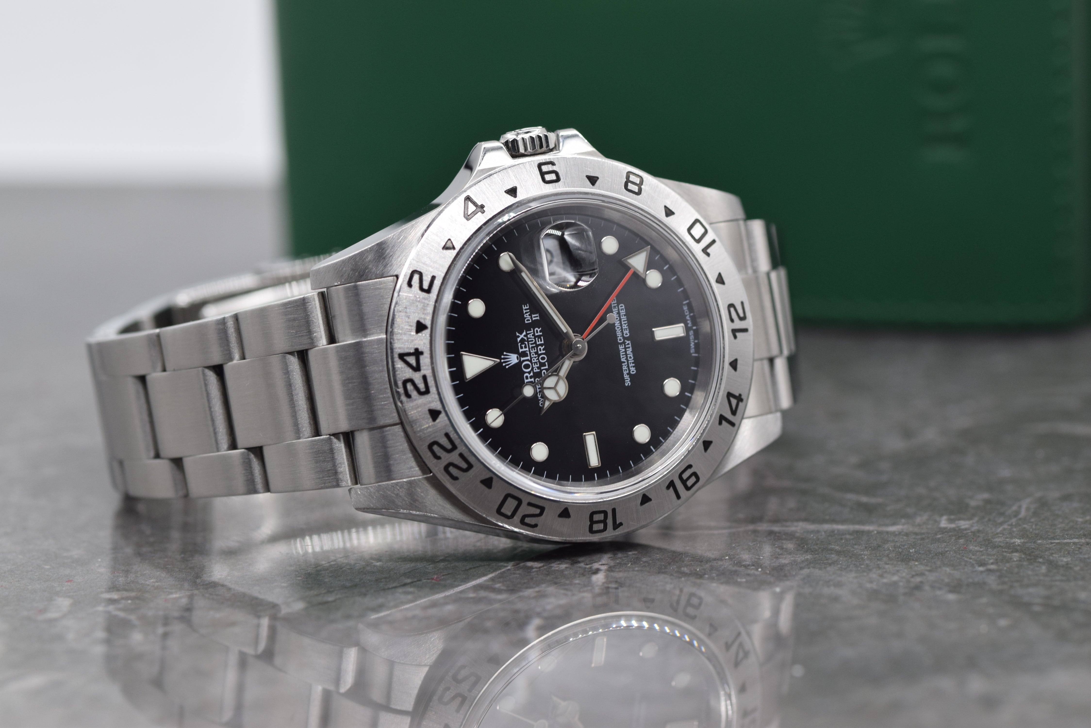 Rolex Oyster Perpetual Explorer II Ref. 16570 mit schwarzen Zifferblatt, Papieren und Rolex Service Etui.