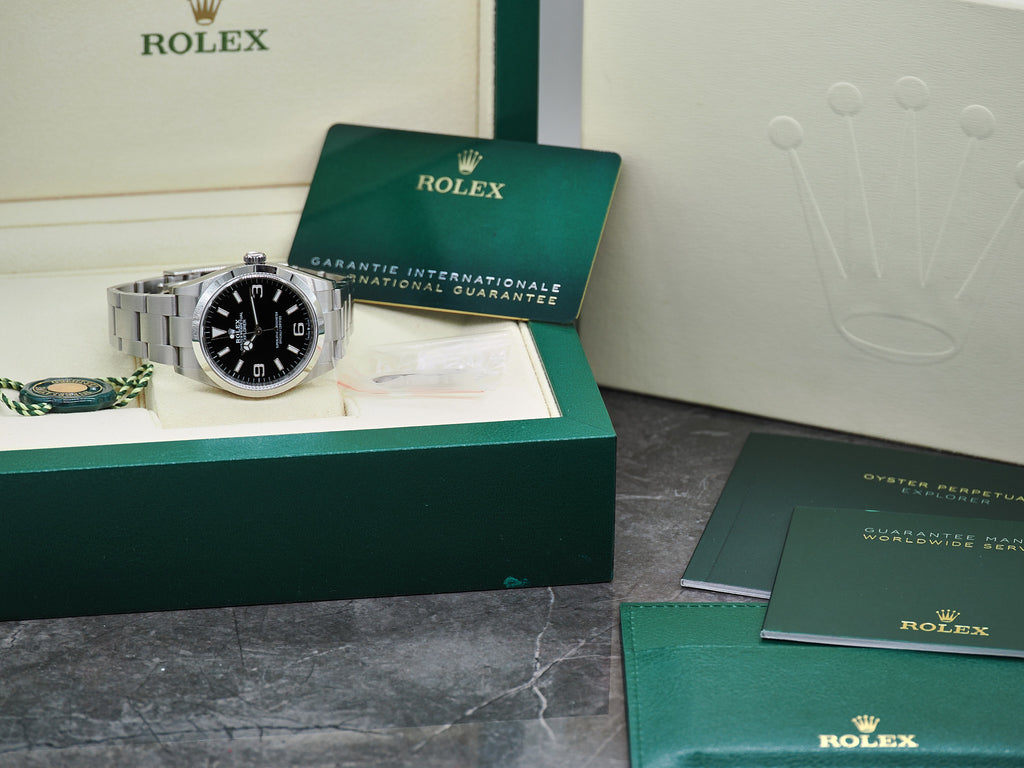 Das Fullset inkludiert: Die originale Rolex Explorer 124270, Garantiekarte (01.2023), Kartenhalter, Hangtag, Begleithefte, beiliegende Bandglieder, Nachweis Wasserdichtigkeit (10 Bar) und Gangabweichung (1.3s/d), Box und Umkarton.