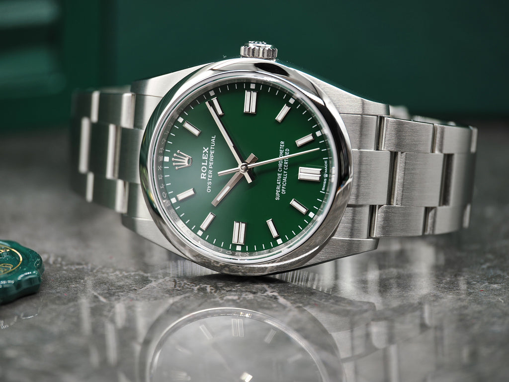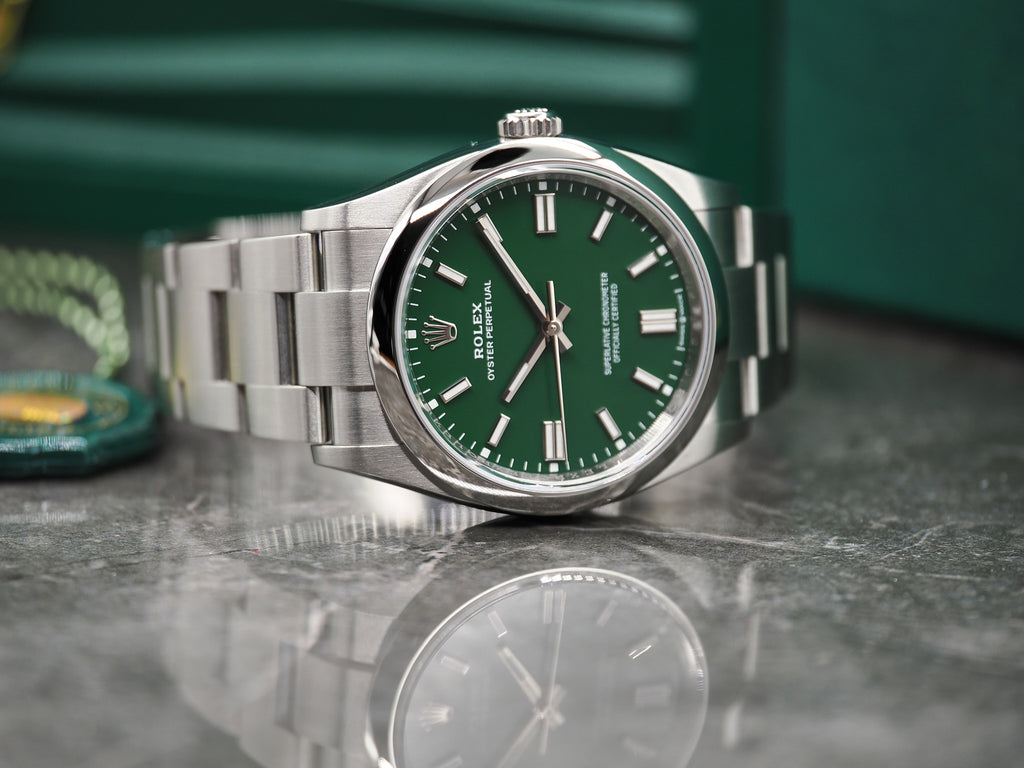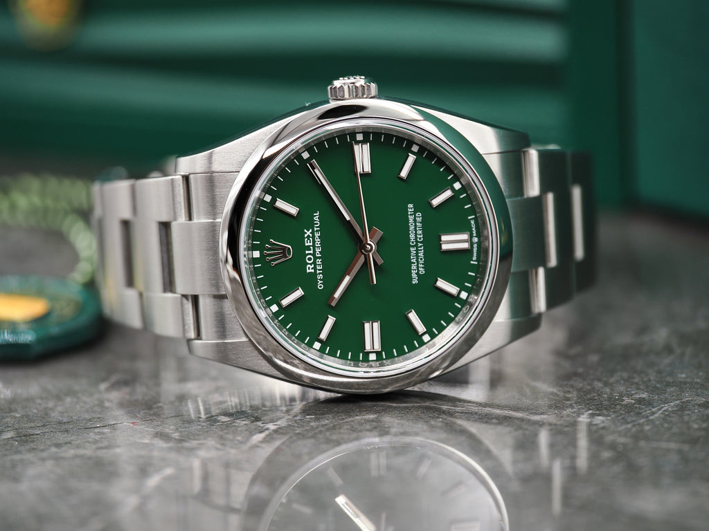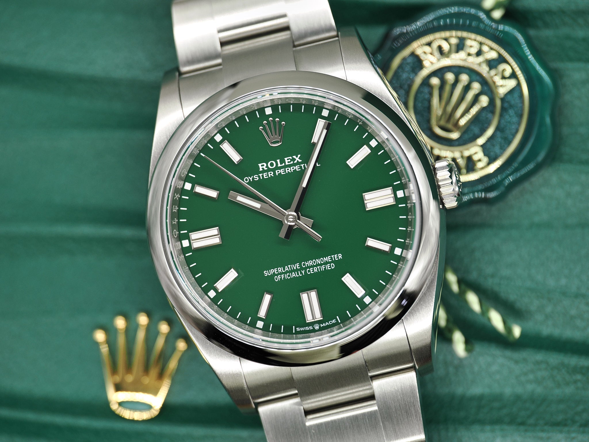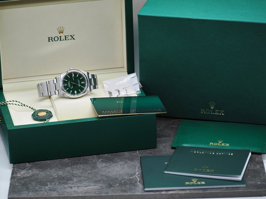 Rolex Oyster Perpetual Ref. 126000 mit grünen Zifferblatt im Fullset mit Erstkaufrechnung aus 11.2025.