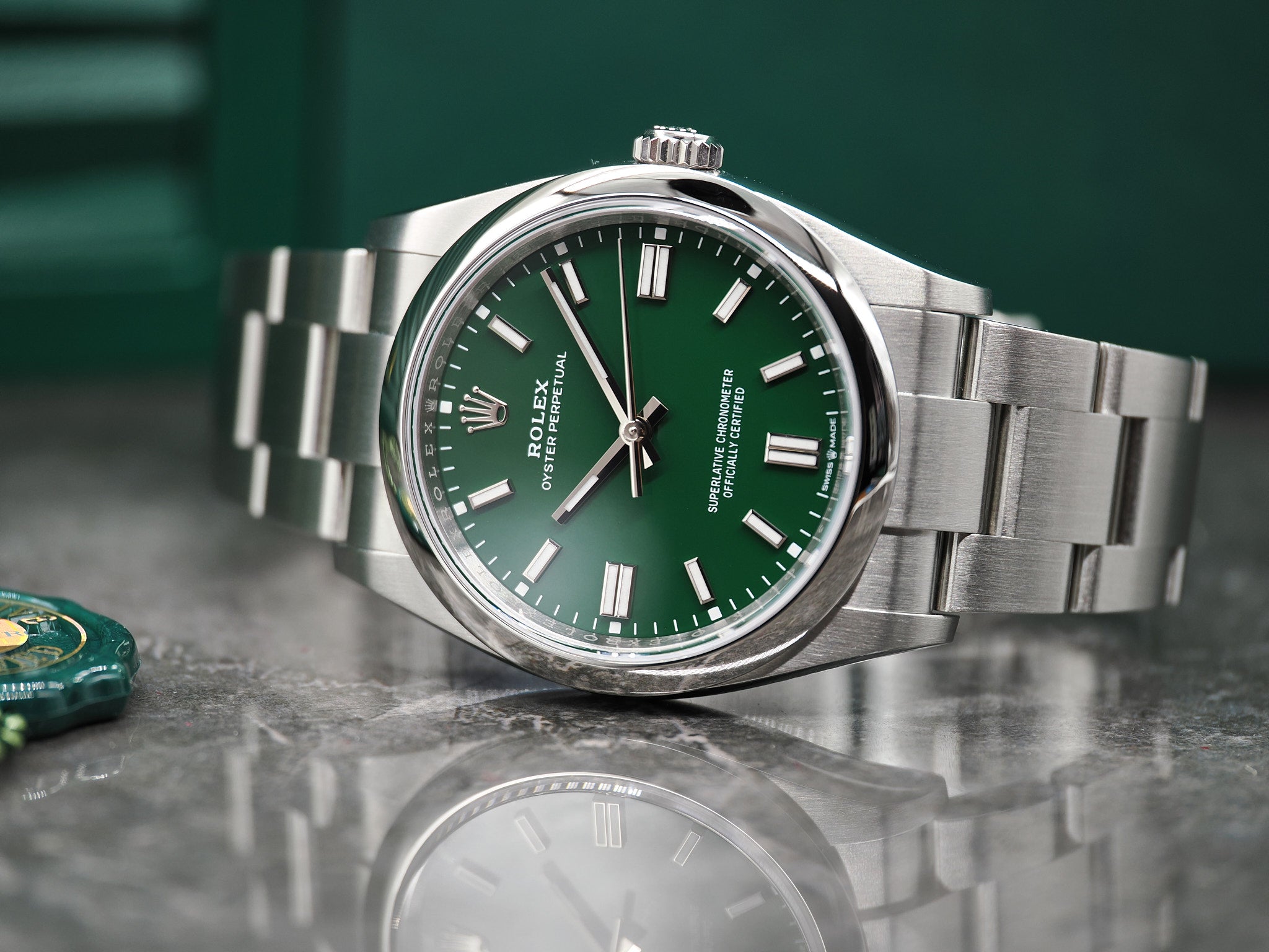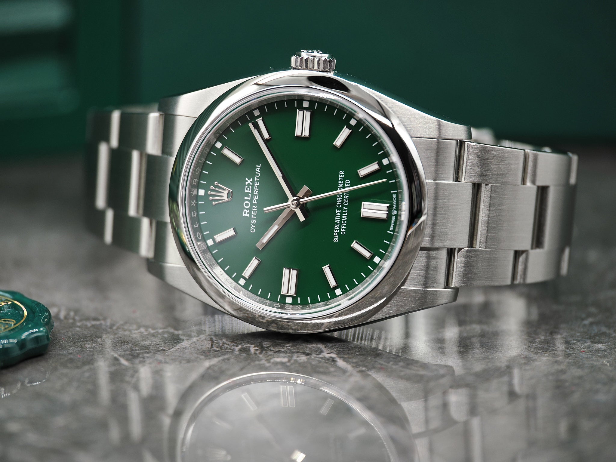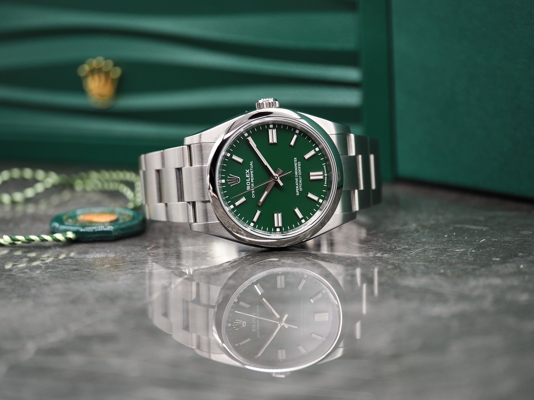 Rolex Oyster Perpetual Ref. 126000 mit grünen Zifferblatt im Fullset mit Erstkaufrechnung aus 11.2025.