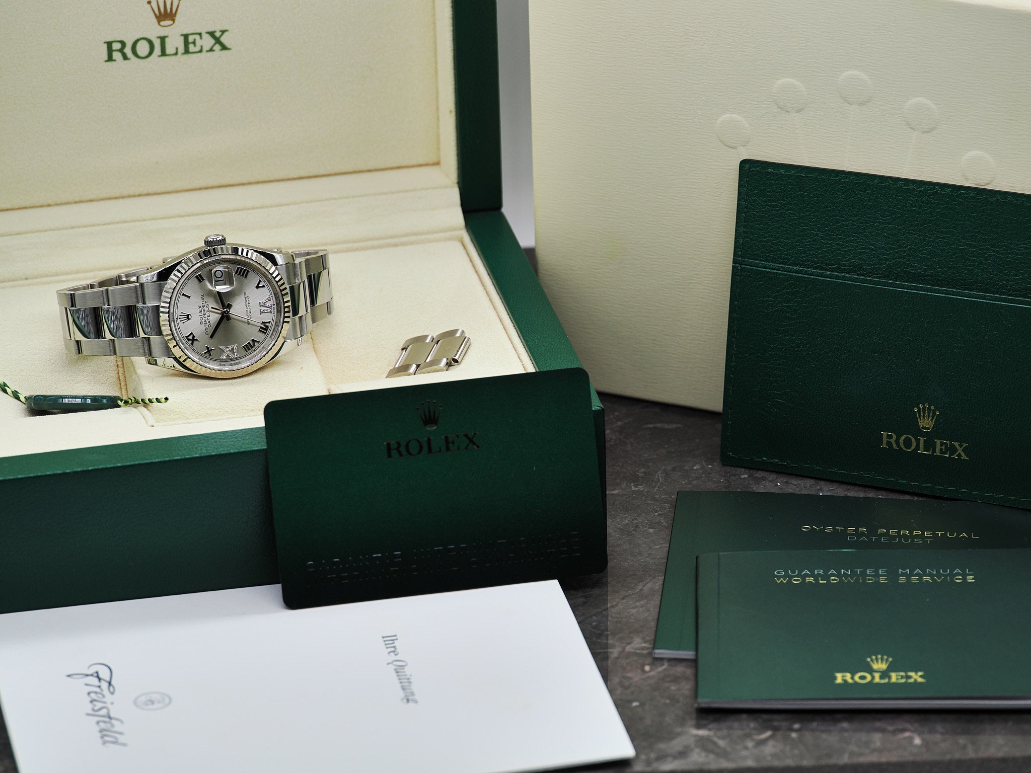 Das Fullset inkludiert die Rolex Datejust 126234, Garantiekarte (02/2024), Erstkaufzertifikat, beiliegende Bandglieder, Begleithefte, Hangtag, Kartenhalter, Rolex Box und Umkarton.