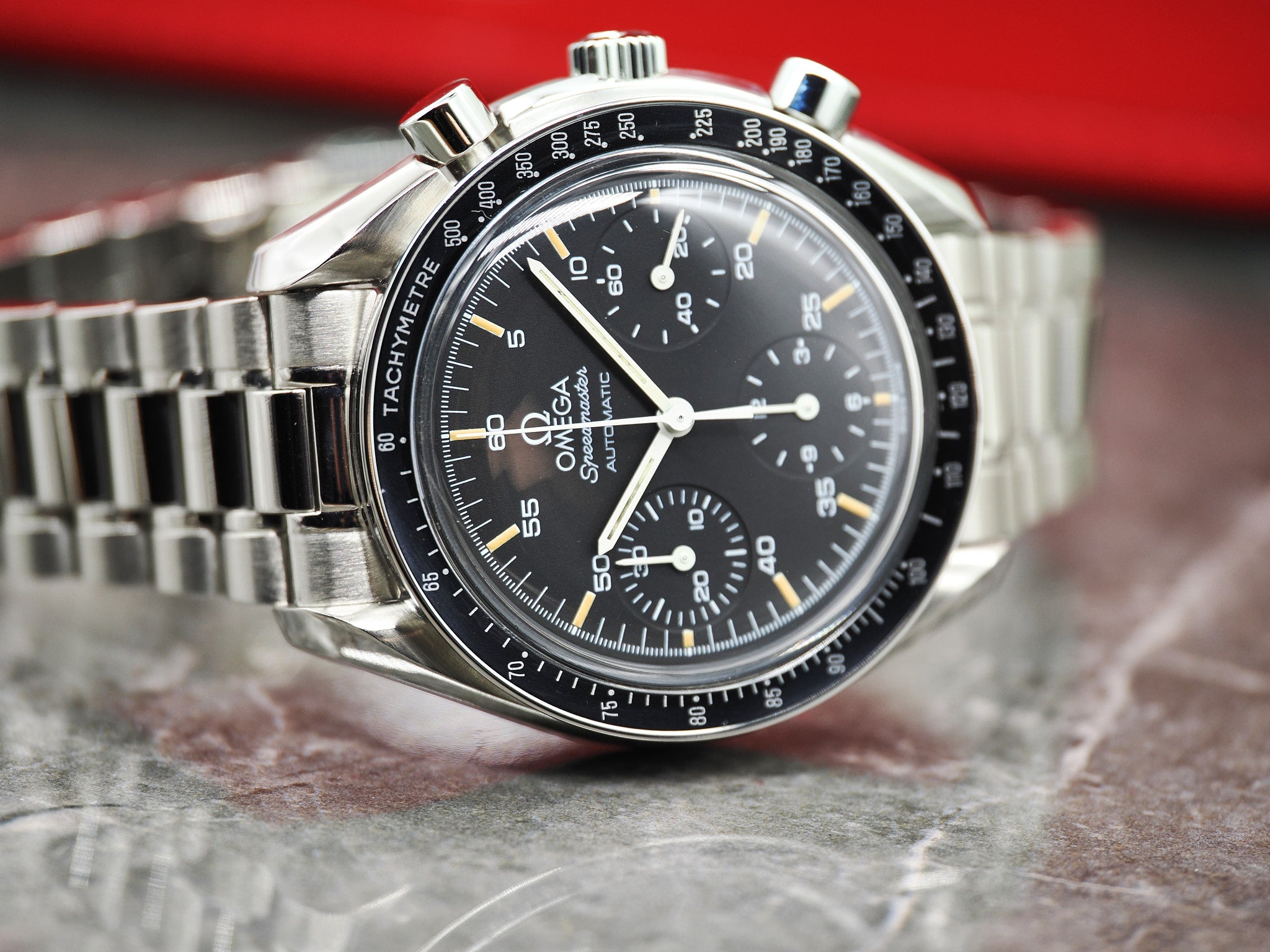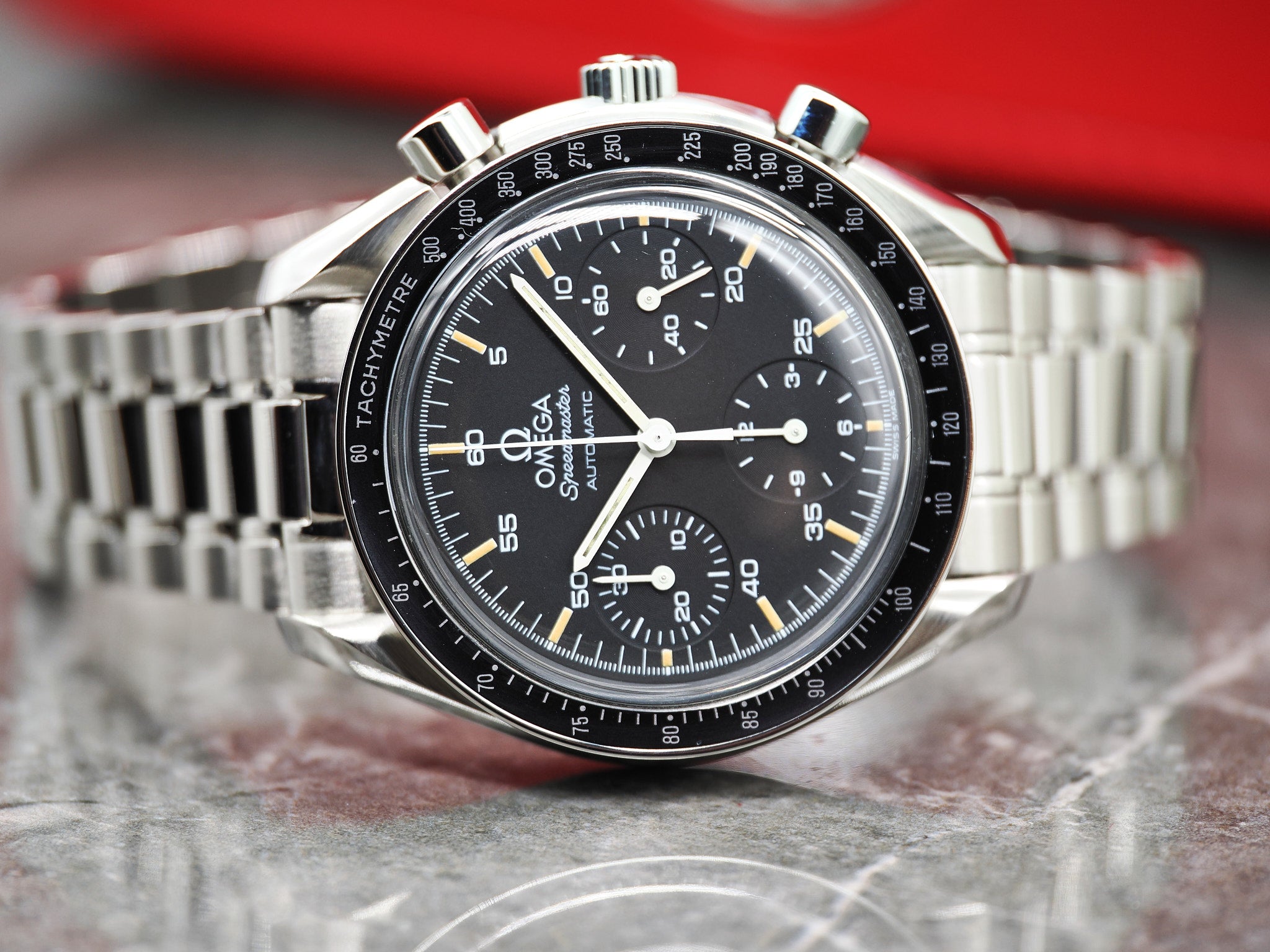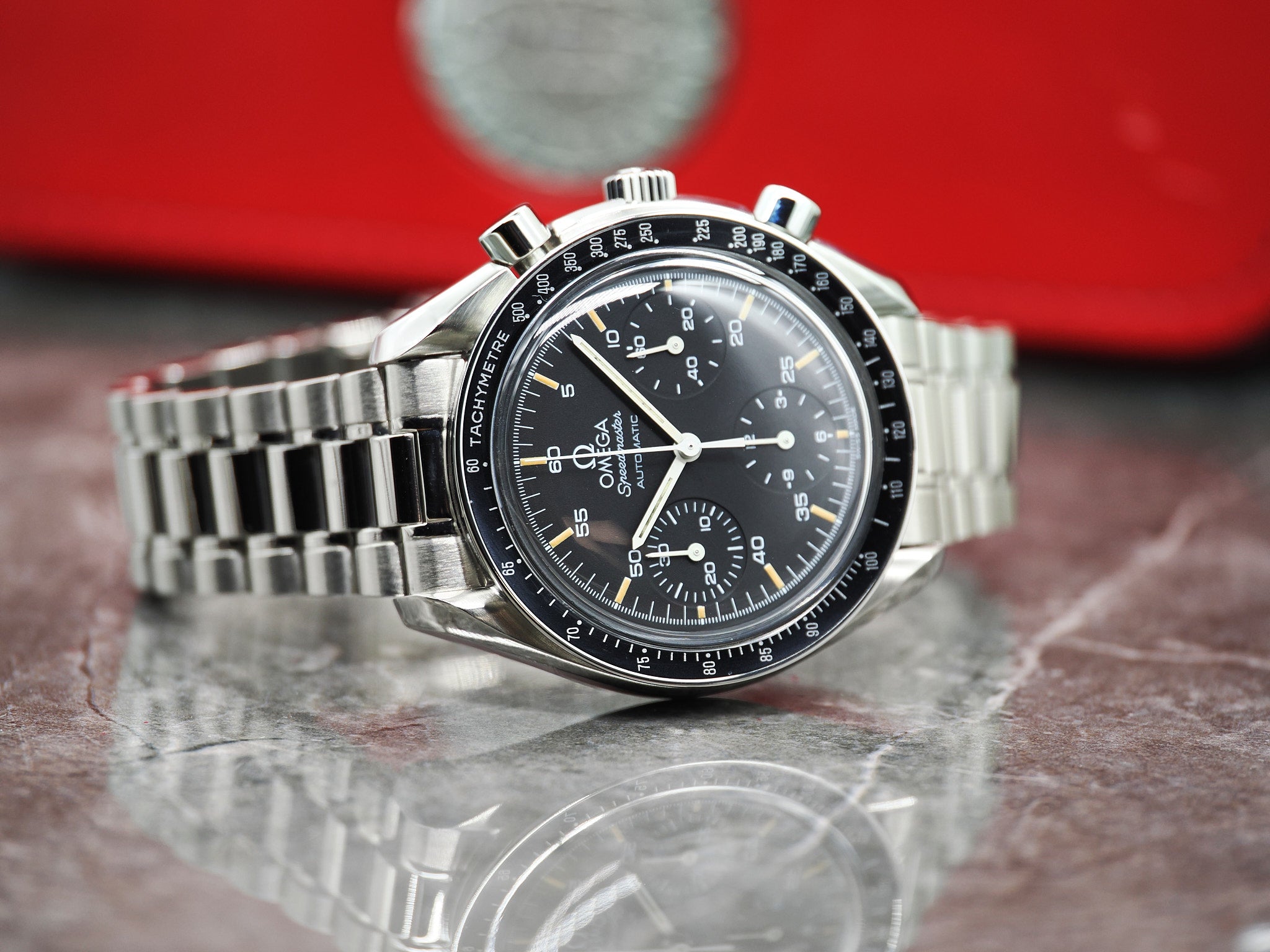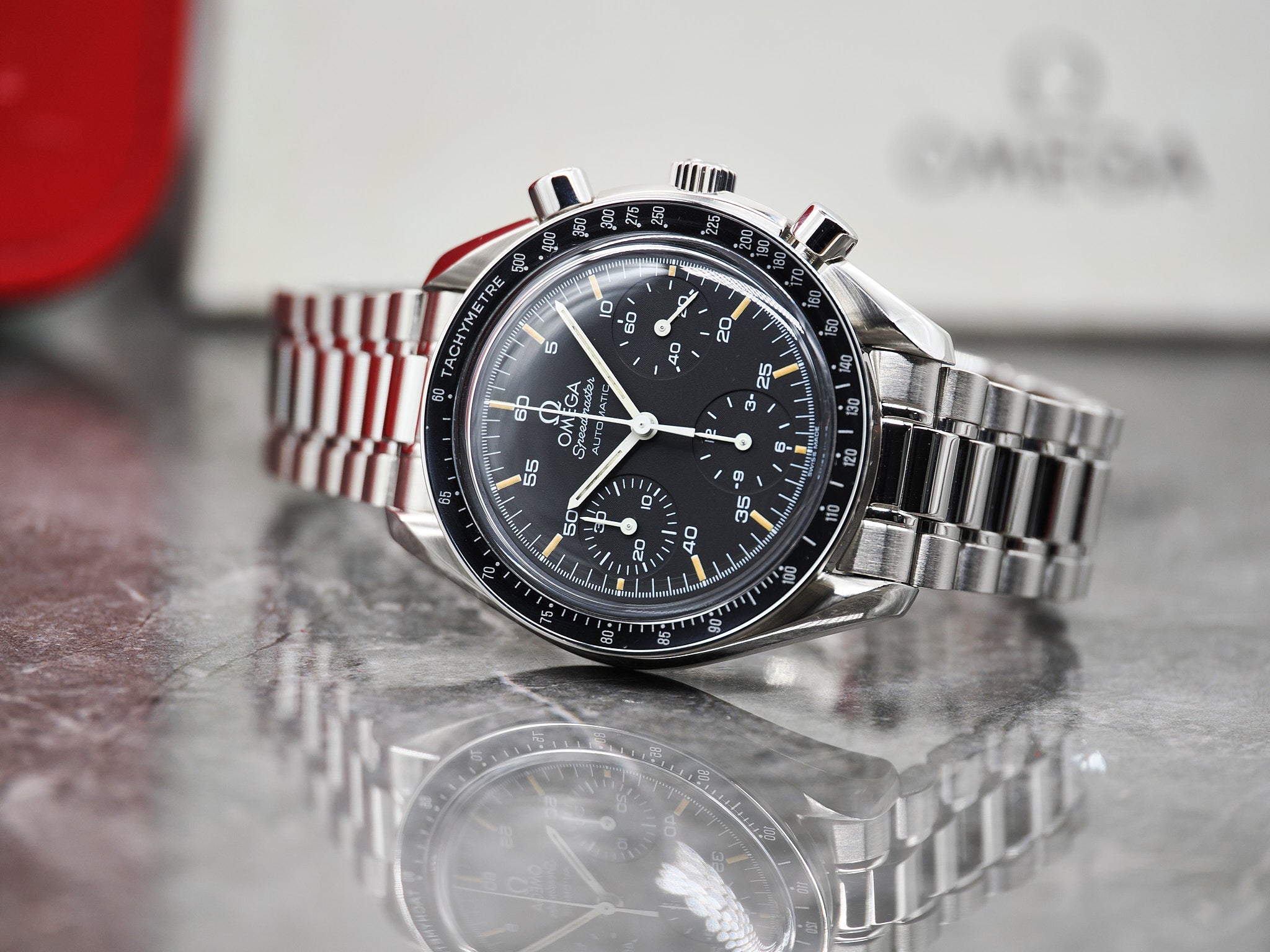 Omega Speedmaster Ref. 3510.50.00 auch als "Omega Speedmaster Reduced" mit Box und Papieren aus 1997.