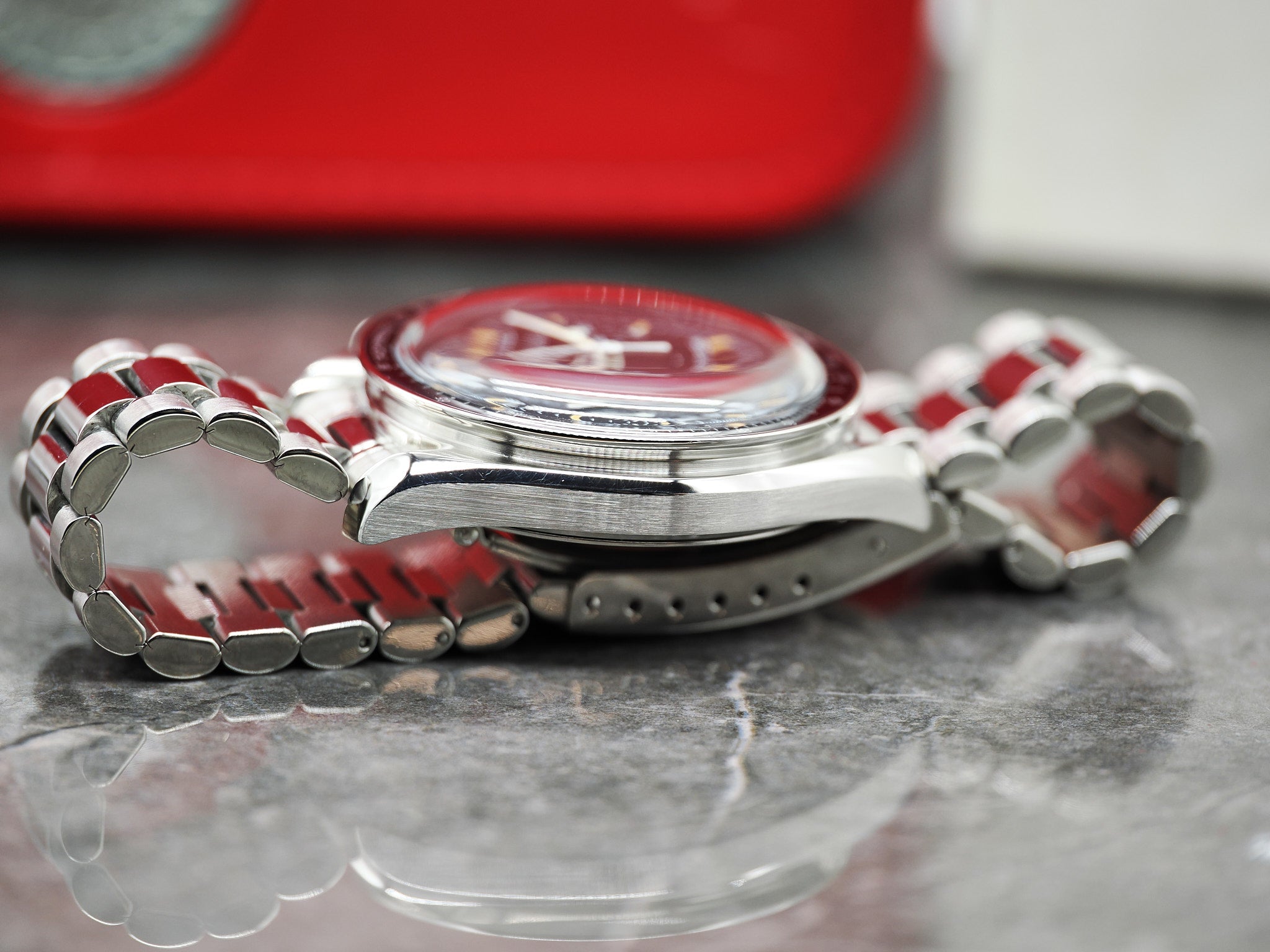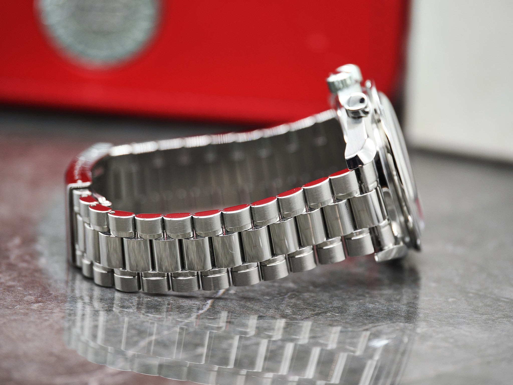 Ein wahrer Klassiker von Omega, der seit über 10 Jahren nicht mehr produziert wird: Die Omega Speedmaster Reduced. Sie ist mit einem Durchmesser von 39mm und einer Höhe von nur 12mm etwas zurückhaltender als die Omega Speedmaster Professional und trägt sich dadurch angenehmer am Handgelenk. Der "Speedmaster Charakter" bleibt durch die Größenunterschiede unberührt und erhalten. Die Omega Speedmaster Reduced ist eine Uhr die in jede Uhrensammlung gehört. Die Preise der 3510.50 steigen kontinuierliche an und gut erhaltene Exemplare, wie dieses, werden immer seltener! Die Uhr hat einen Durchmesser von ca. 39mm. Die Omega passt bis zu einem Handgelenksumfang von ca. 20cm. Zustand Die Omega befindet sich in einem sehr guten Zustand. Das originale Hesalitglas (mit Omega Emblem) ist ebenfalls in einem sehr guten Zustand und trägt nur wenige Mikrokratzer. Bitte nutzen sie die hochauflösenden Bilder um sich einen Eindruck zu verschaffen, diese gelten als Zustandsbeschreibung. Die Omega wurde technisch überprüft und funktioniert einwandfrei. Es besteht langfristig kein Bedarf für einen Service. Sie erhalten ein Jahr Garantie auf das Uhrwerk. Das Uhrenkissen weißt Spuren auf. Die Omegabox weißt altersbedingte Gebrauchsspuren auf. Das Set inkludiert die Omega Speedmaster Reduced, Kartenhalter, Bedienungsanleitung, Garantiekarte (1997), Nachweis Ganggenauigkeit (5.8s/d) und Wasserdichtigkeit (5 Bar), die originale Box und Umkarton. Bei Fragen können Sie uns jederzeit kontaktieren. Händlerrechnung Zu diesem Artikel wird Ihnen selbstverständlich eine Händlerrechnung ausgestellt. |
