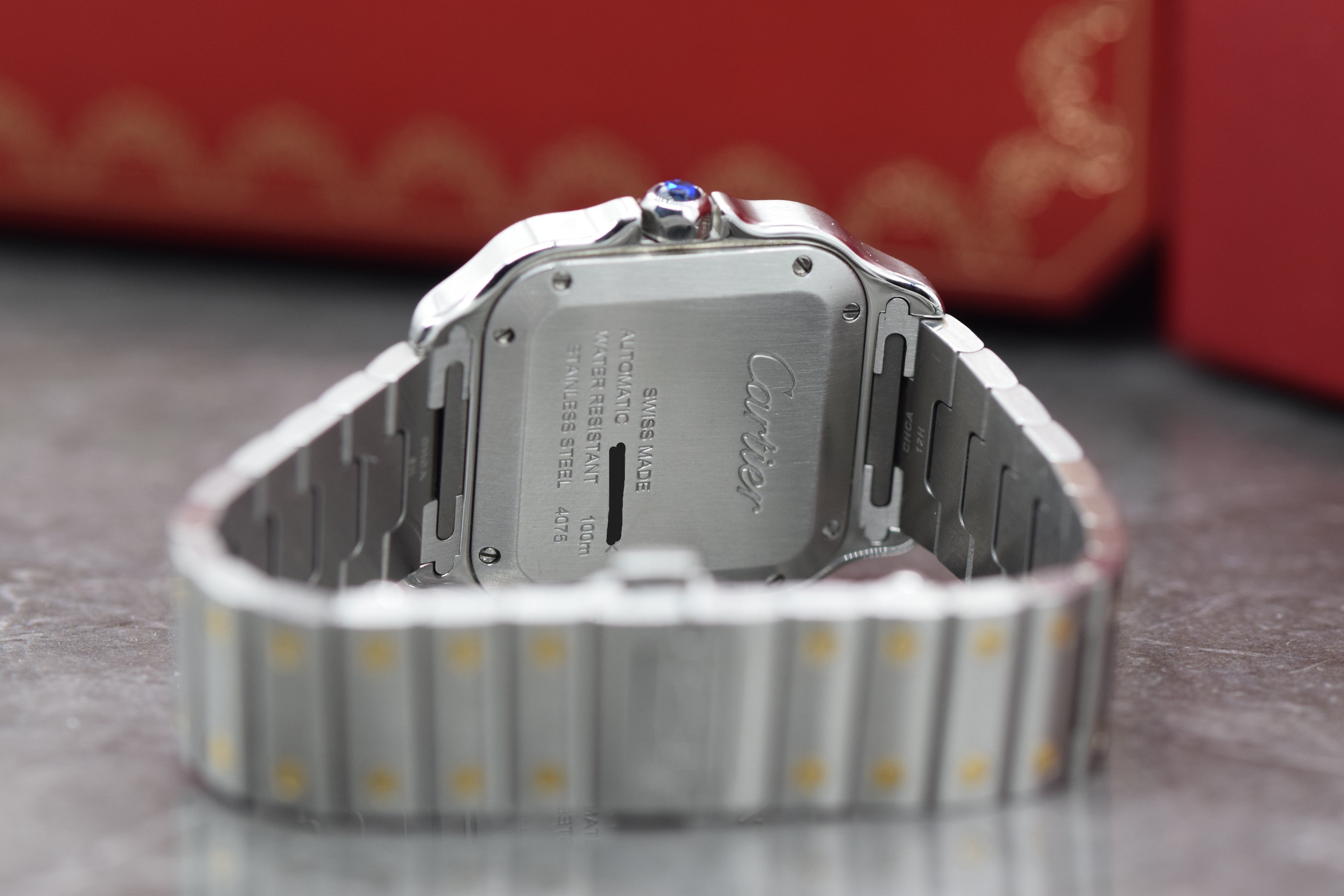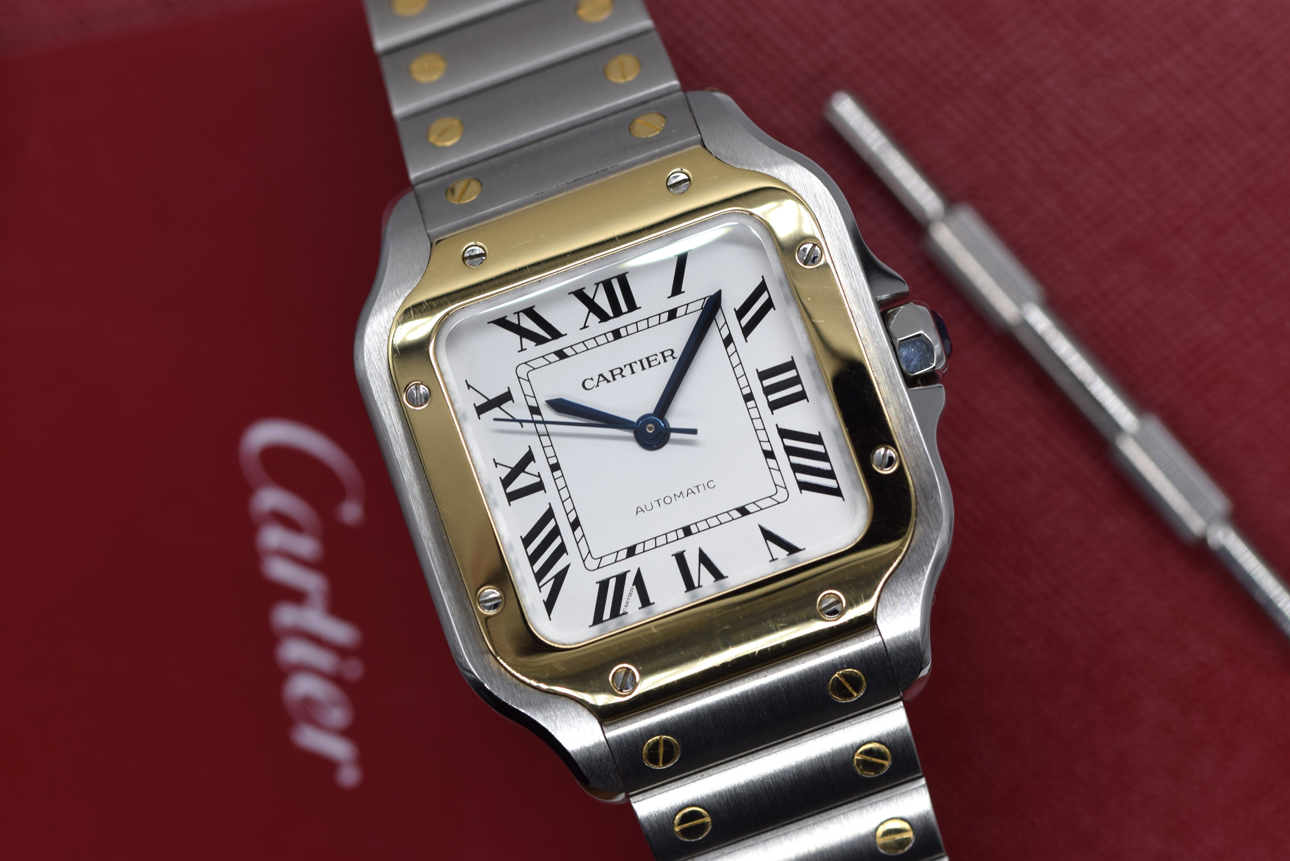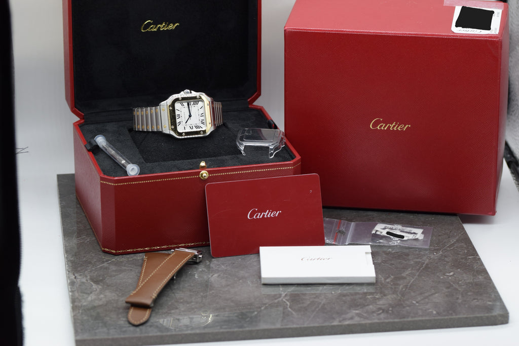 Das Fullset inkludiert die Cartier Santos, Garantiekarte (05.2022), zuätzliches Cartier Lederarmband mit Faltschließe, Lünettenschutz, Bandwechselwerkzeug, Begleithefte, Hangtags, Nachweis Wasserdichtigkeit (10Bar) und Gangabweichung (4.6s/d), Box und Umkarton.