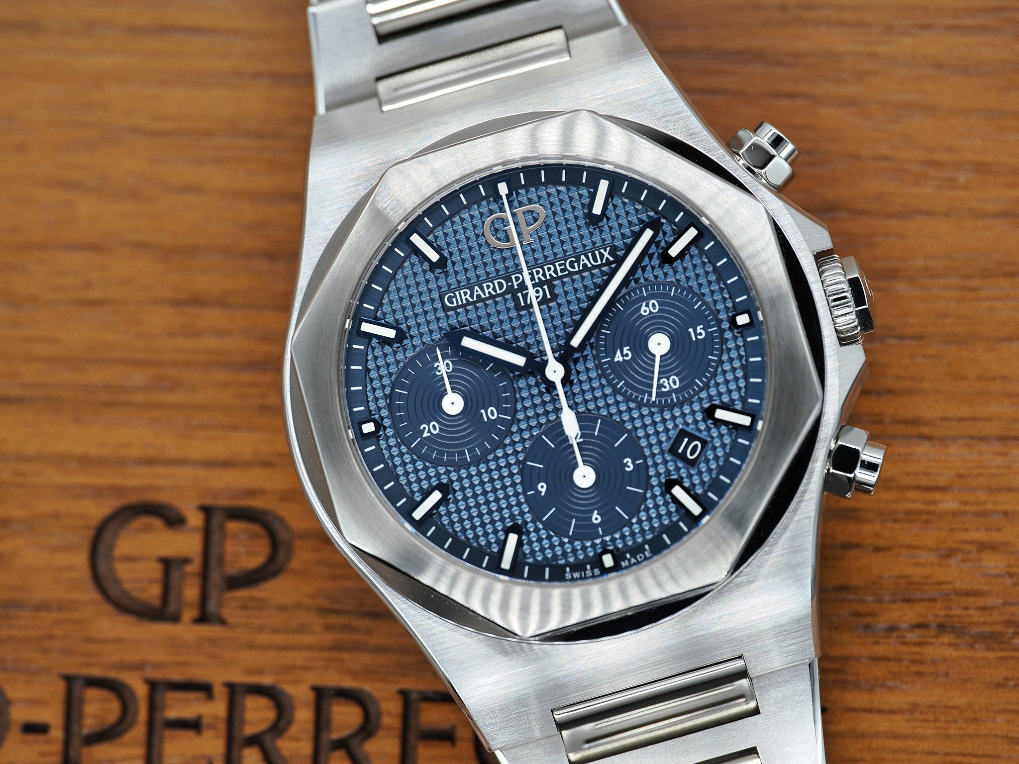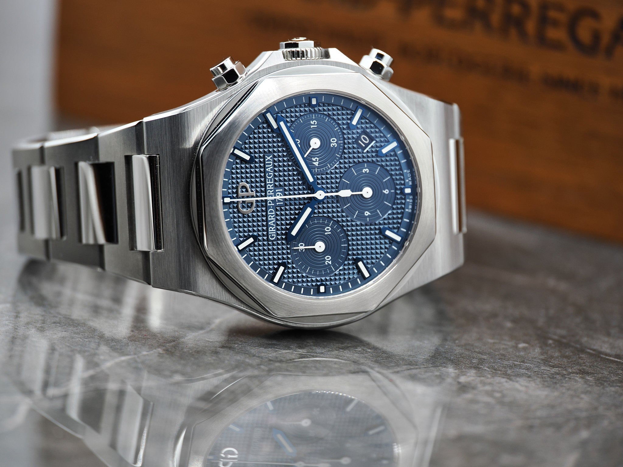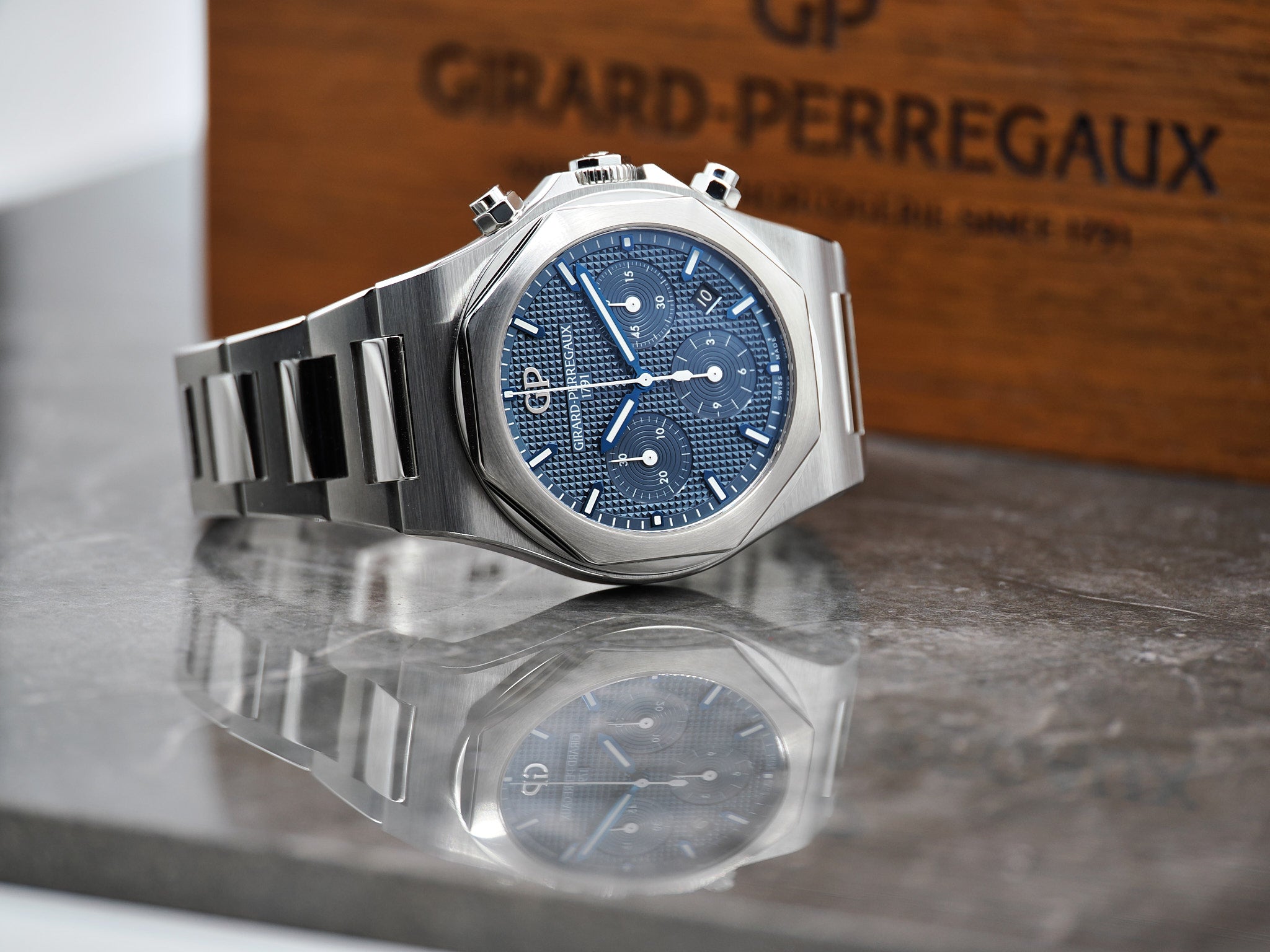 Girard-Perregaux Laureato Ref. 81020-11-431-11A mit blauen Zifferblatt mit Box und Papieren aus 2022.