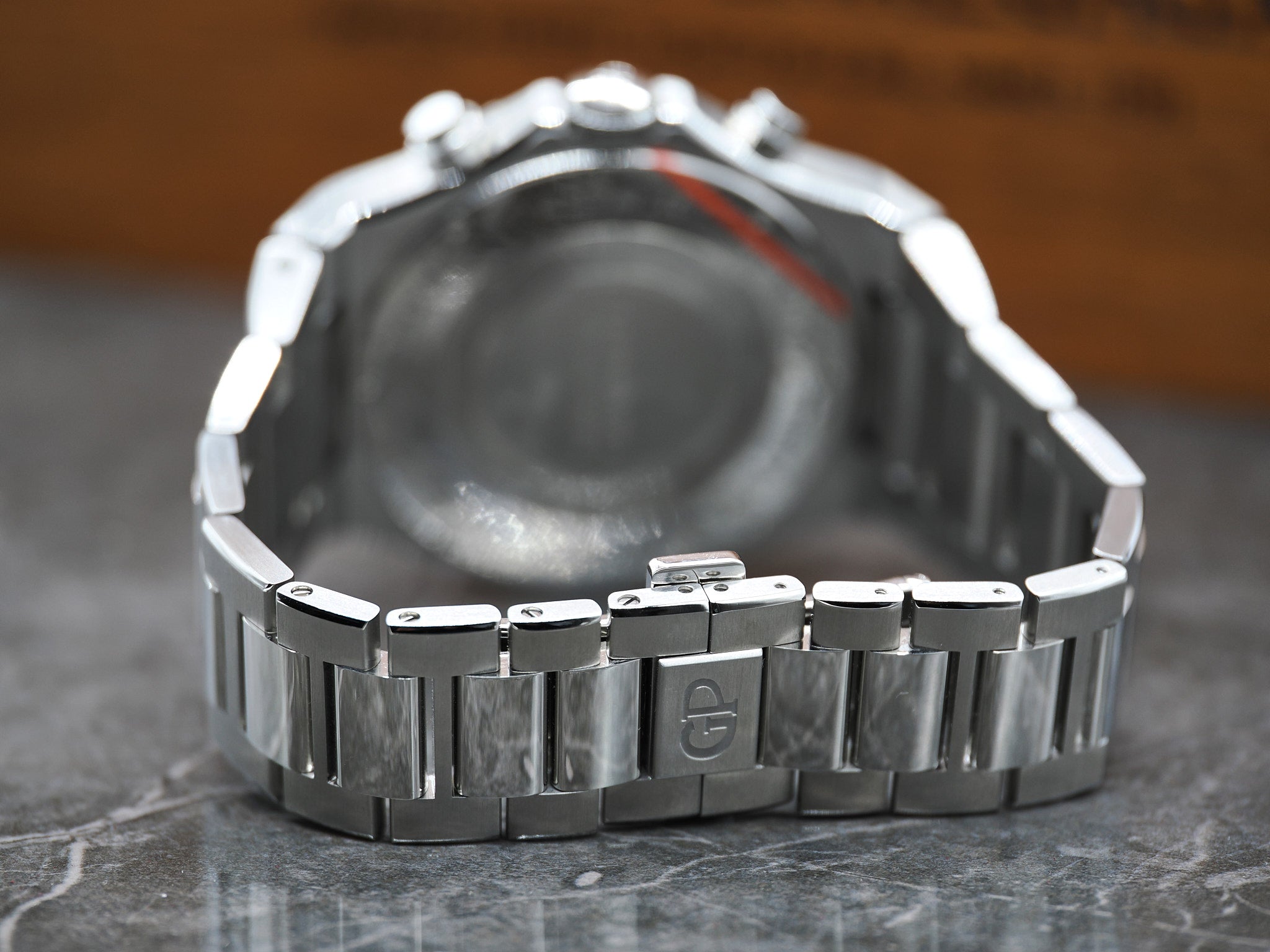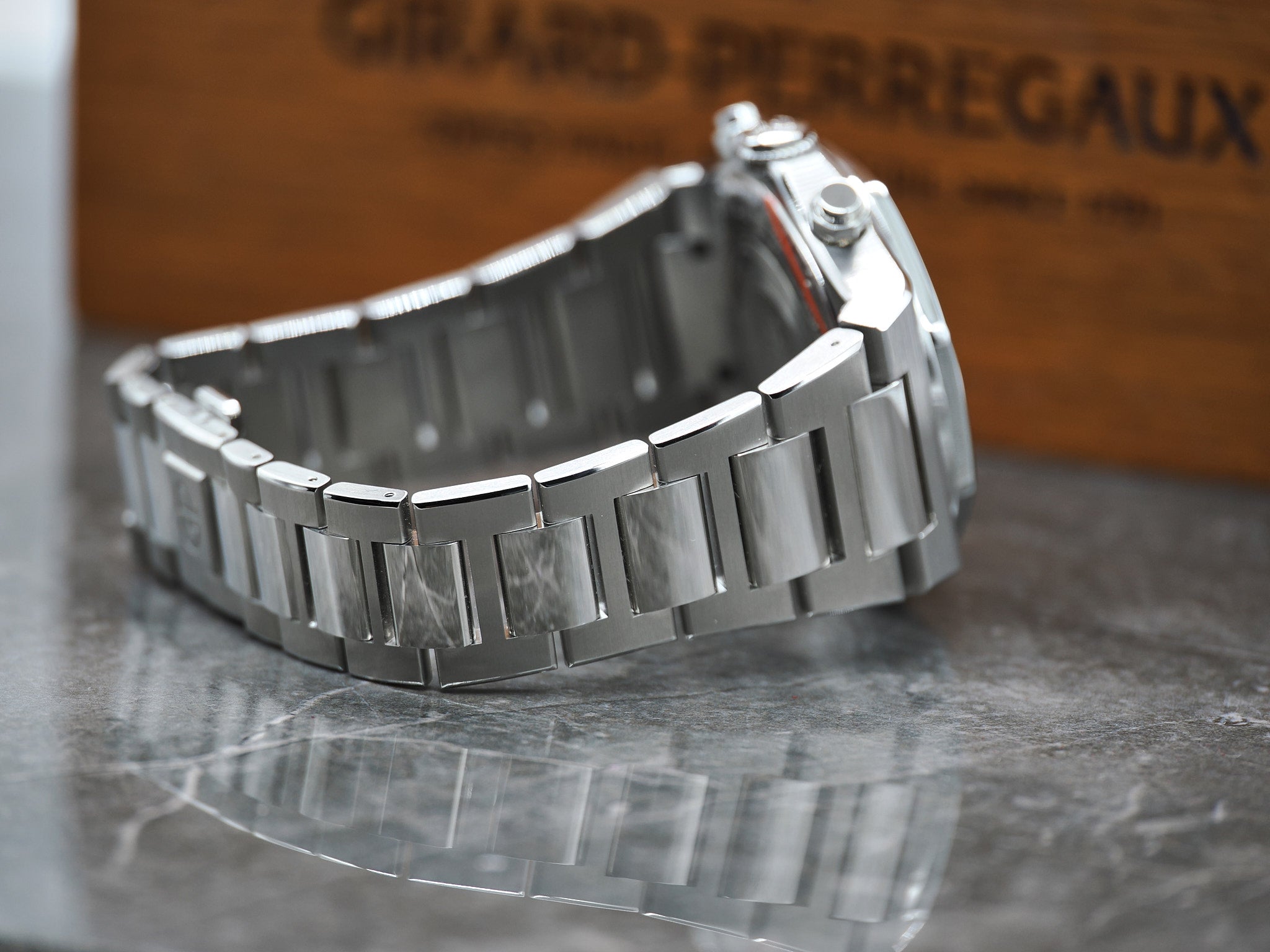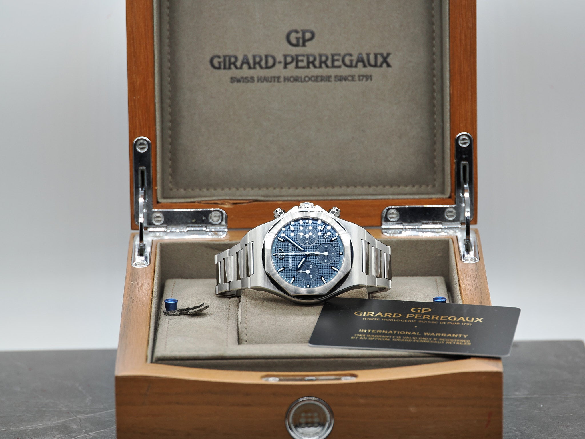 Mit einer Produdukionszahl von nur 12.000 Uhren pro Jahr ist Girard-Perregaux eine der exklusivsten High-End Luxusmarke in der gesamten Uhrenbranche. GP wurde im Jahr 1791 gegründet und ist eined er ältesten Schweizer Uhrenmarken. Die Laureato wurde im Jahr 1975 vorgestellt und ist eine perfekte Uhr ohne Kompromisse. Der aktuelle Listenpreis beträgt 19.400,00 Euro. Der Durchmesser der Laureato beträgt 42mm. Die GP passt bis zu einem Handgelenksumfang von ca. 20,5cm . Zustand Die Girard-Perregaux befindet sich in einem sehr guten bis neuwertigen Zustand. Das Saphirglas weist keine Kratzer auf. Bitte nutzen sie die hochauflösenden Bilder um sich einen Eindruck zu verschaffen, diese gelten als Zustandsbeschreibung. Das Werk der GP wurde überprüft und für einwandfrei befunden. Es besteht langfristig kein Bedarf für einen Service. Sie erhalten ein Jahr Garantie auf das Werk ab dem Kaufdatum. Die Holzbox von GP trägt Gebrauchsspuren. Das Set inkludiert: Die originale Girard-Perregaux Laureato, Garantiekarte (01.2022),Nachweis Wasserdichtigkeit (10 Bar) und Gangabweichung (2.9s/d), sowie die große GP Holzbox. Bei Fragen können Sie uns jederzeit kontaktieren. Händlerrechnung Zu diesem Artikel wird Ihnen selbstverständlich eine Händlerrechnung ausgestellt. Mehrwertsteuer Der Artikel wird nach § 25 A USTG (Differenzbesteuerung) besteuert. |