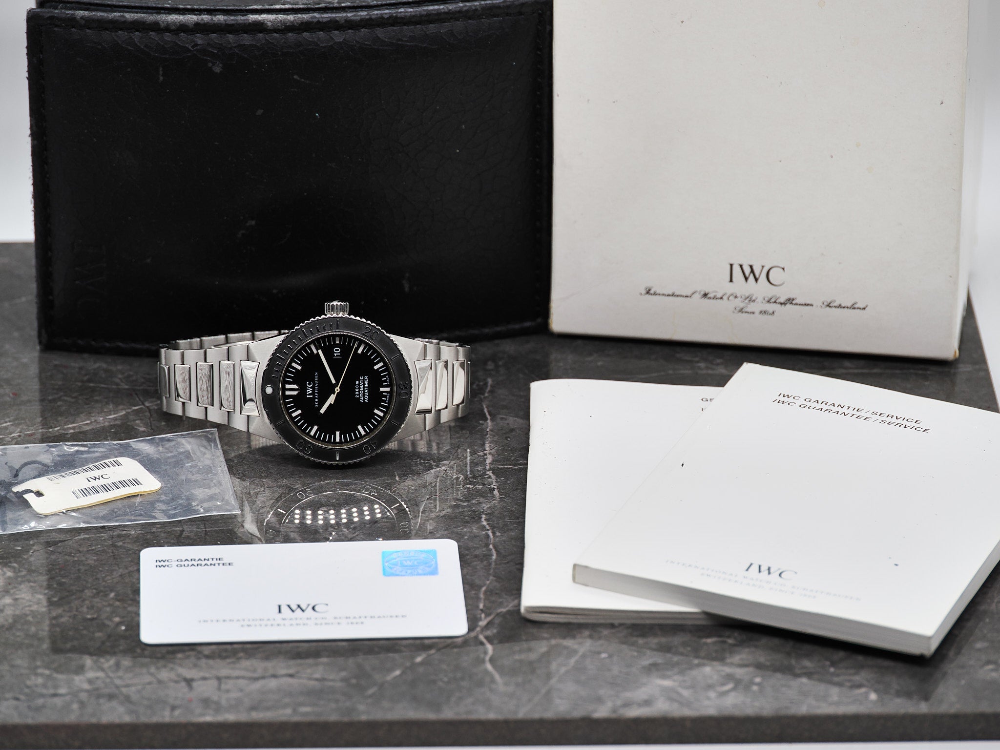 Das Fullset inkludiert die IWC Aquatimer 2000, Internationale Garantiekarte IWC (07.2004), Begleithefte, Nachweis Gangabweichung (4.9s/d) und die Wasserdichtigkeit (5 Bar), Box und Umkarton.