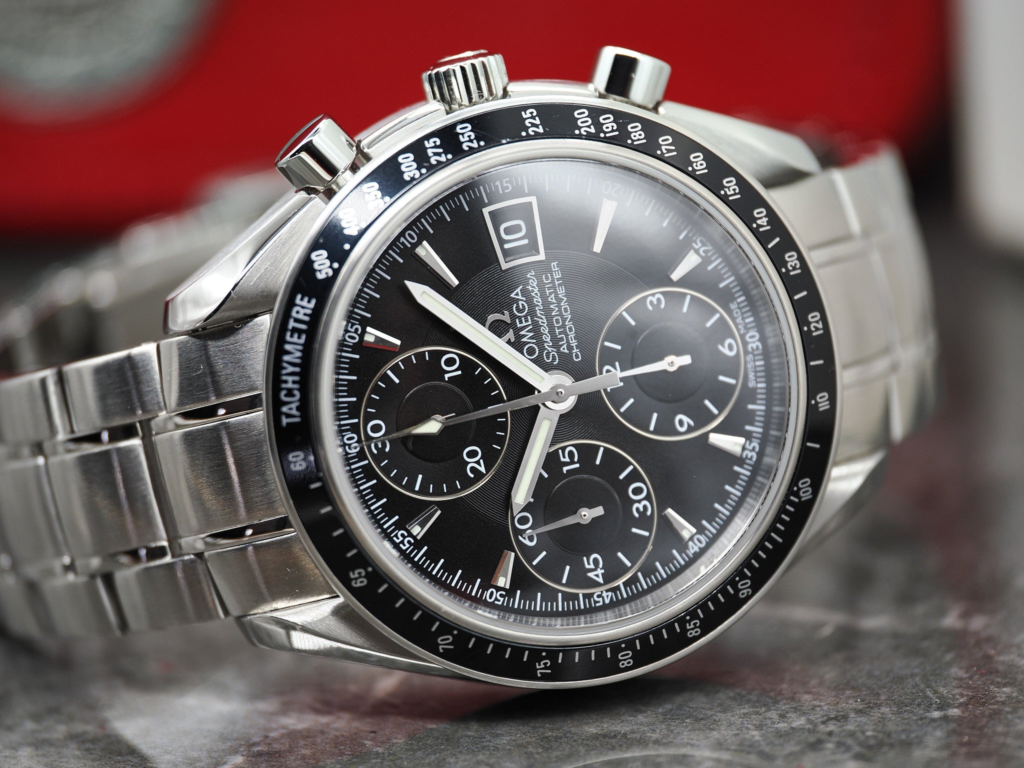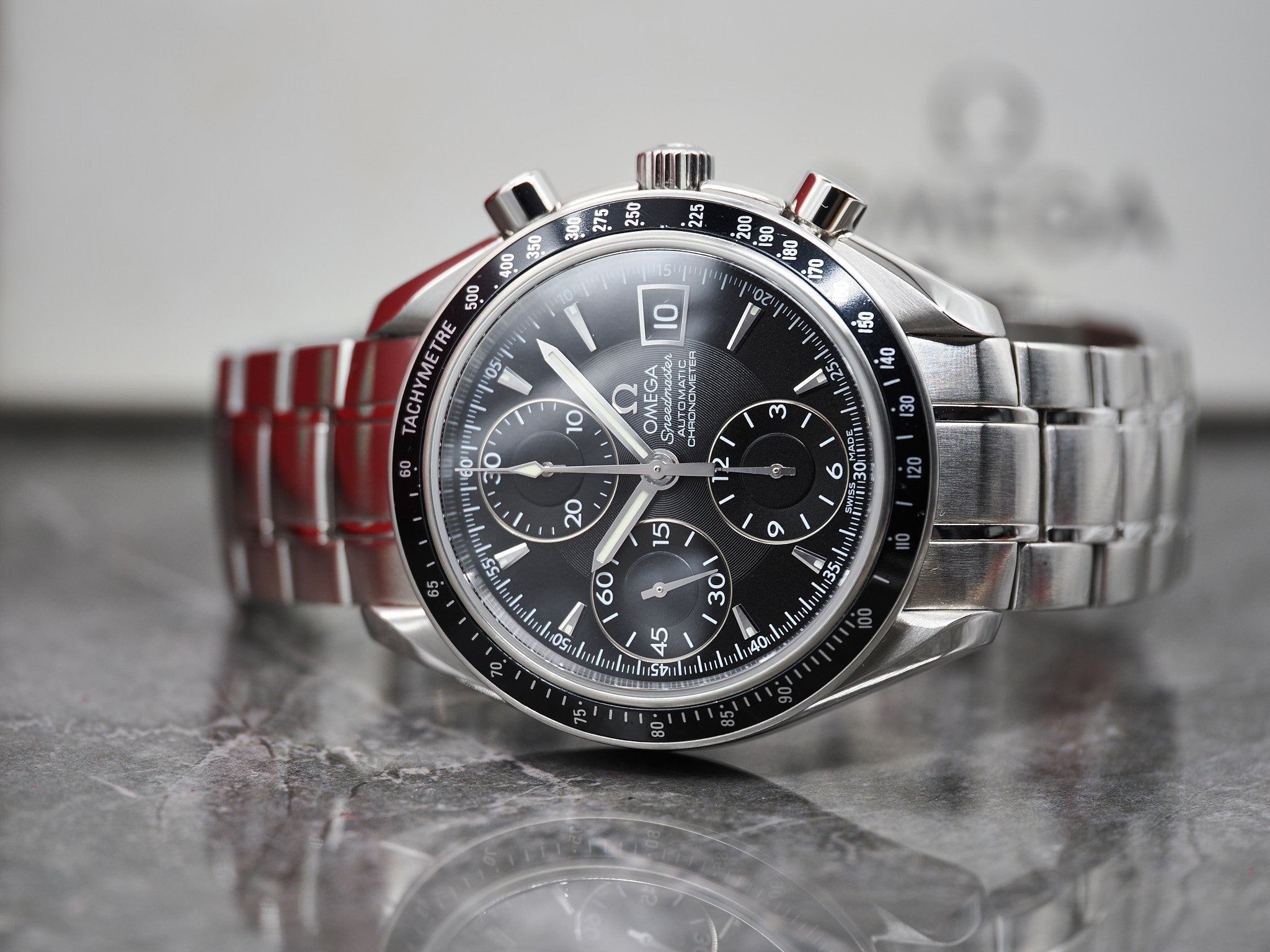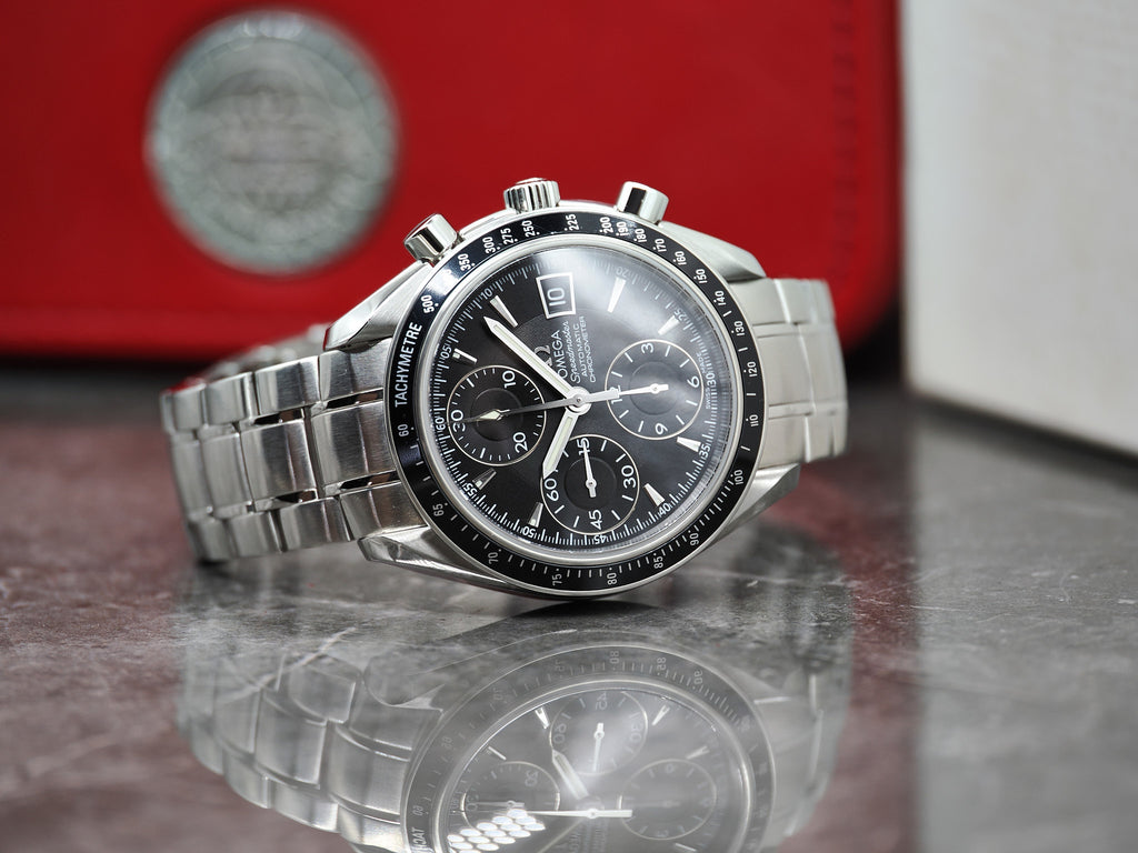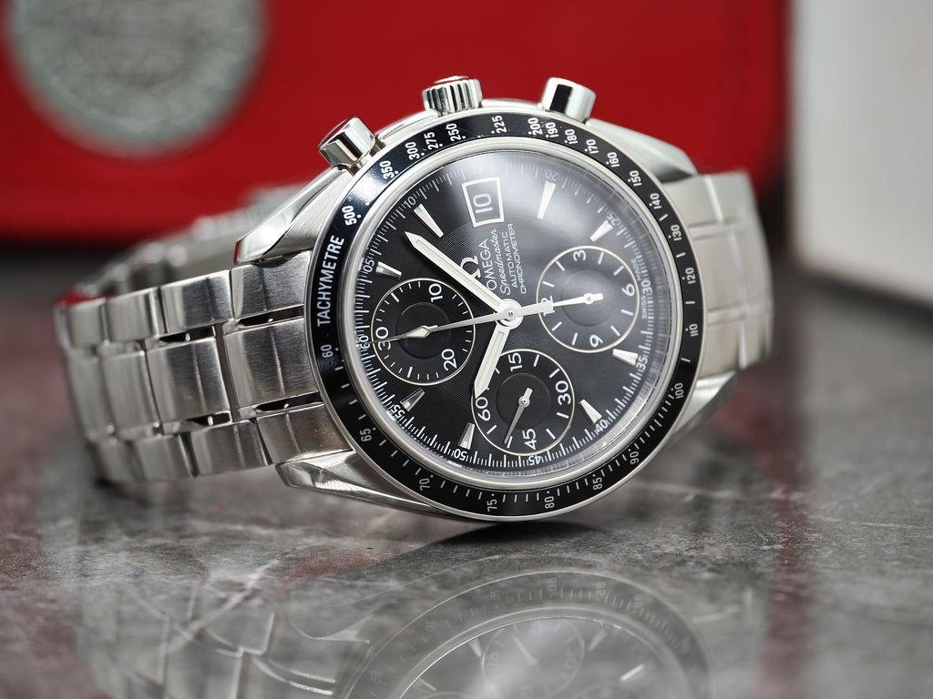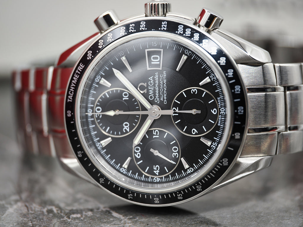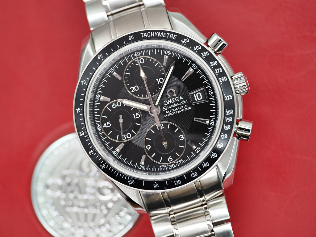 Die Omega Speedmaster Date ist ein perfekter Chronograph für den alltäglichen Bedarf. Das schwarze Ziffernblatt mit eingerahmten Datum und den hochwertigen, aufgesetzten Indizes inkl. Omega Emblem sorgen für einen tollen Charakter, der sowohl edel als sportlich erstrahlt. In der Omega ist das robuste Omega Kaliber 1164 mit einer Gangreserve von 44 Stunden verbaut. Diese Referenz ist im Vergleich zu den 3513xxxx Referenzen 1mm größer, besitzt die Chronometer Zertifizierung und ist zudem bis zu 100 Meter, bei Auslieferung, wasserdicht. Zusätzlich ist die Lünette nicht mehr aus Stahl.