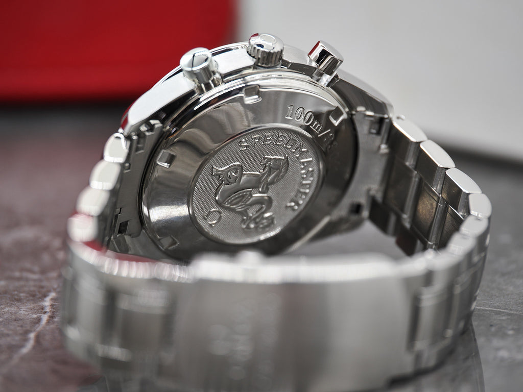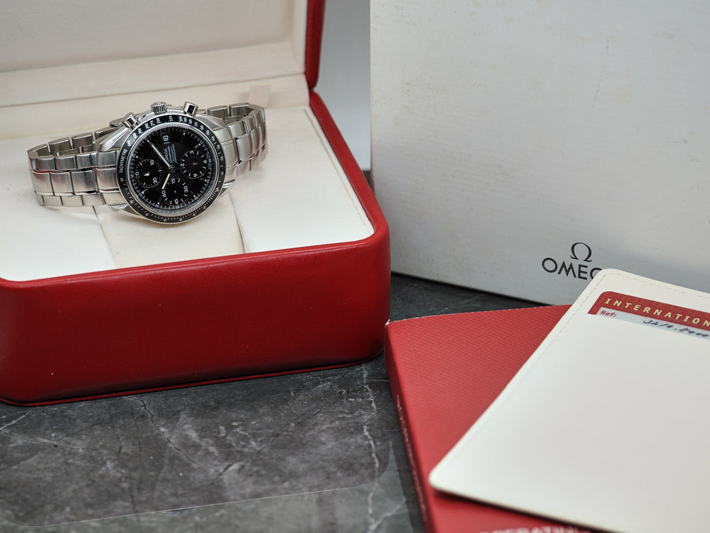 Das Set inkludiert: Die originale Omega Speedmaster Date, Garantiekarte (06.2014), Kartenhalter, Bedienungsanleitung, Nachweis Wasserdichtigkeit (3 Bar) und Gangabweichung (2.1s/d), Box und Umkarton.
